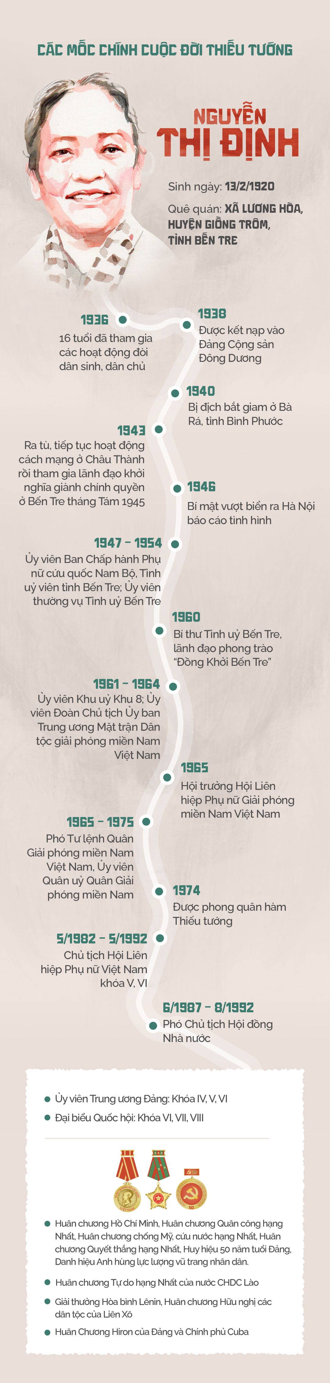 Đồng chí Nguyễn Thị Định sinh ngày 13/2/1920, ở xã Lương Hòa, huyện Giồng Trôm, tỉnh Bến Tre. 16 tuổi, bà giác ngộ và bắt đầu tham gia cách mạng, đảm nhận nhiệm vụ giao liên, rải truyền đơn và vận động quần chúng đấu tranh. Tháng 10/1938, bà được kết nạp vào Đảng Cộng sản Đông Dương (nay là Đảng Cộng sản Việt Nam).