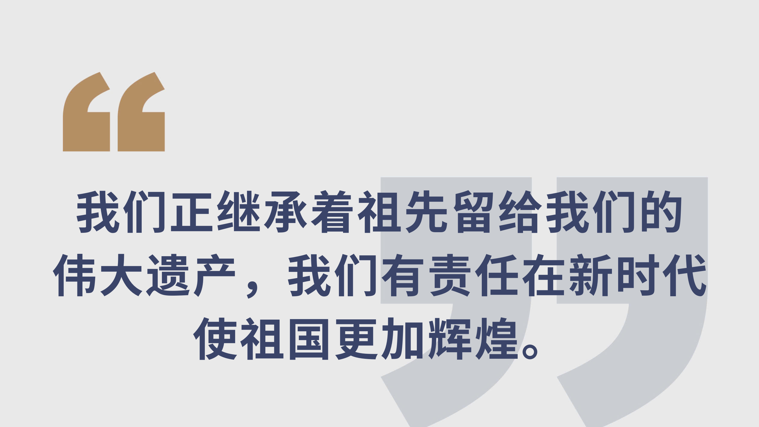 当今这一代人——从干部、党员、公职人员到工人、农民、知识分子、企业家、学生、大学生、各阶层人民,作为“龙子仙孙”,都应深刻认识到:我们正继承着祖先留给我们的伟大遗产,我们有责任在新时代使祖国更加辉煌。今天的每一个行动,都必须配得上先辈曾经流血牺牲的巨大代价,配得上整个民族曾经经历的巨大牺牲与痛苦。