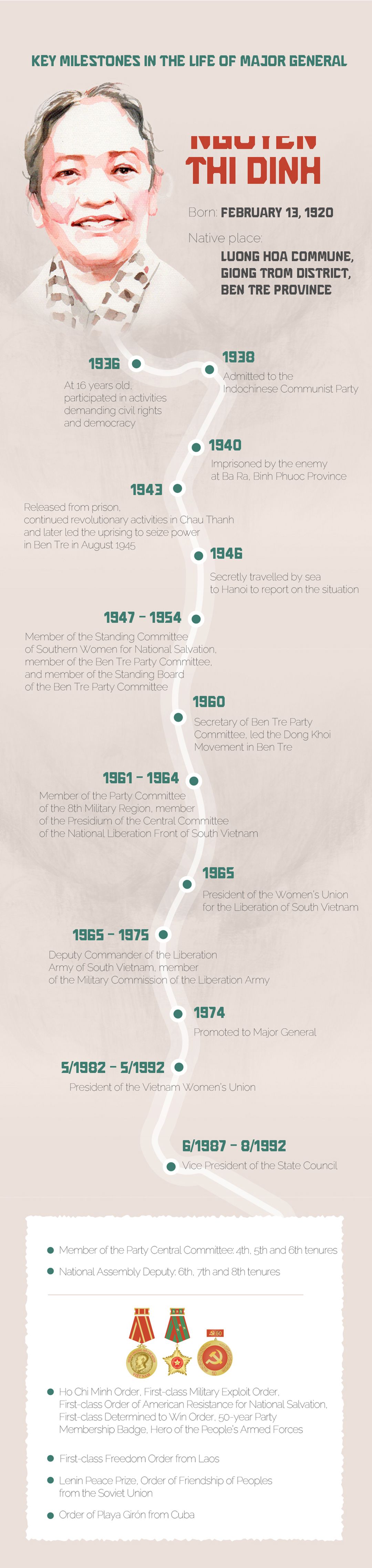 Nguyen Thi Dinh was born on February 13, 1920, in Luong Hoa Commune, Giong Trom District, Ben Tre Province. At the age of 16, she became politically aware and joined the revolutionary movement, undertaking tasks such as communication, distributing leaflets, and mobilising the masses. In October 1938, she was admitted to the Indochinese Communist Party (now the Communist Party of Vietnam).