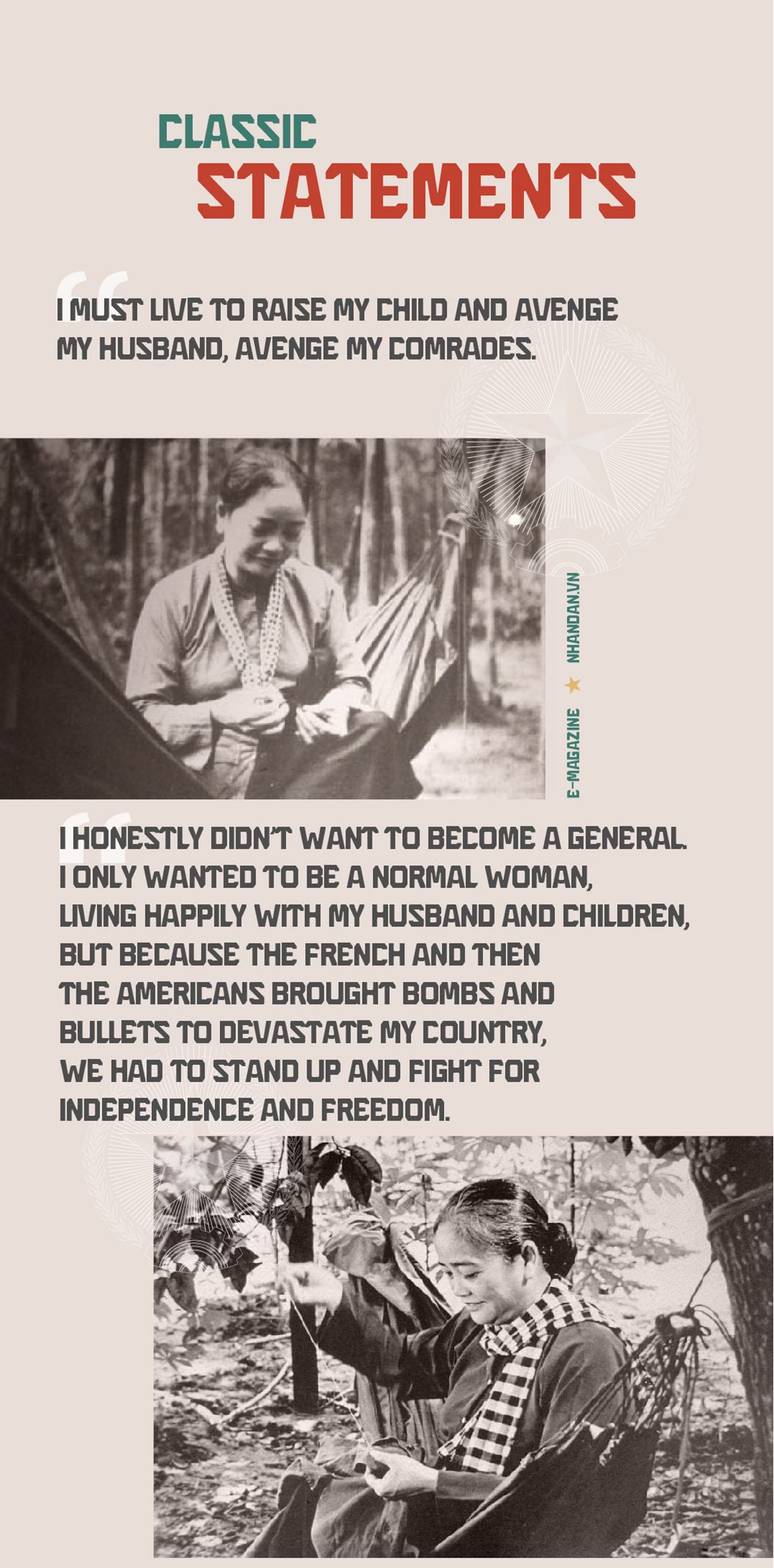 Throughout the anti-American resistance war, she and the Command of the Liberation Army of South Vietnam the Southern Command developed close bonds with the people, gaining numerous victories, contributing to the liberation of the South and the reunification of the country. In recognition of her contributions, she was promoted to Major General in April 1974, making her the first female general in the Vietnam People's Army.