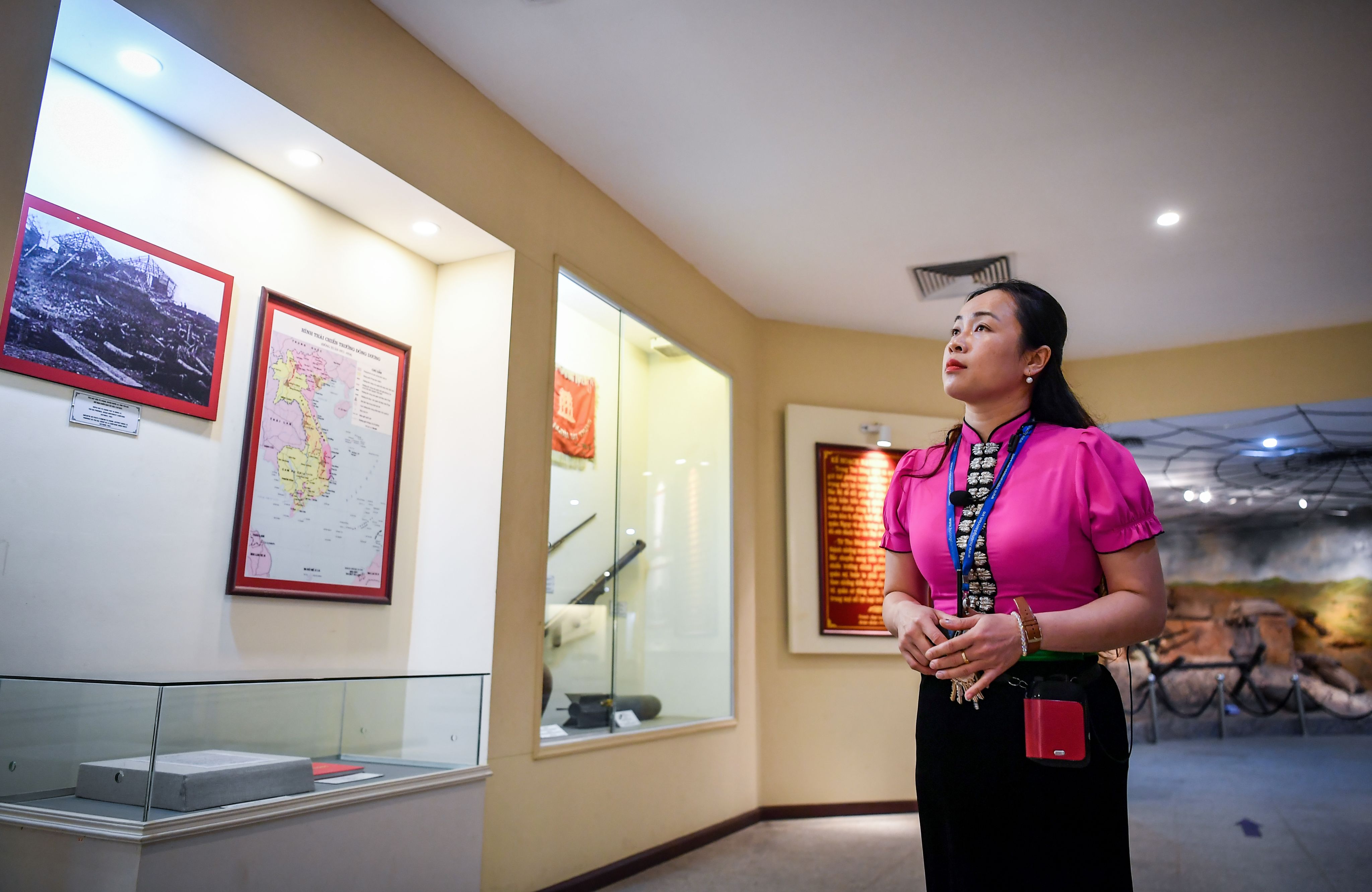 Chị Nguyễn Thùy Dương (SN 1986) bắt đầu làm hướng dẫn viên tại Bảo tàng từ năm 2017. Chị là cháu ngoại của chiến sĩ Điện Biên Phủ Nguyễn Minh Xuân (SN 1929), thuộc Đại đoàn 316, đánh trong trận đồi A1.