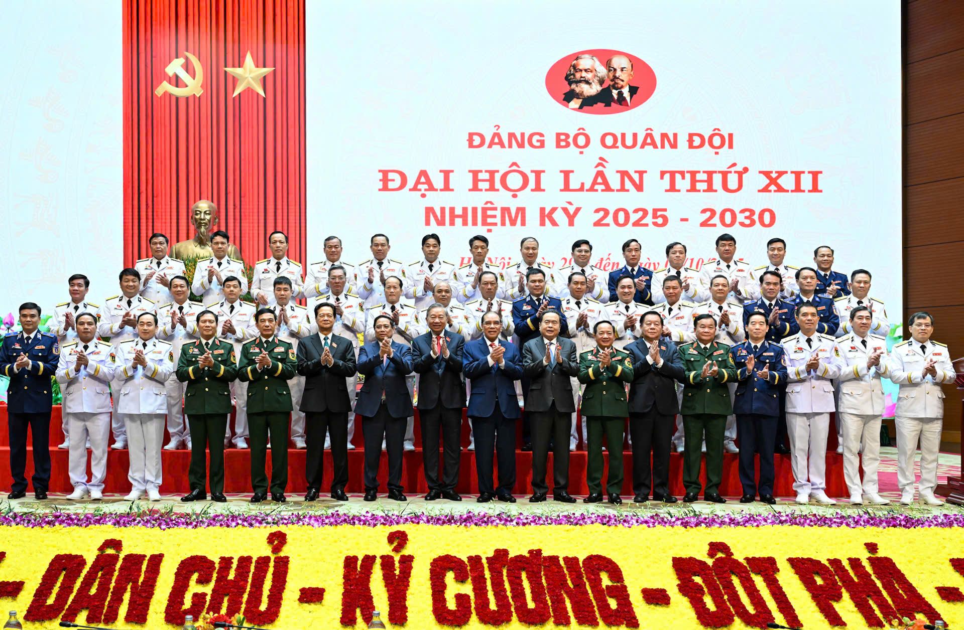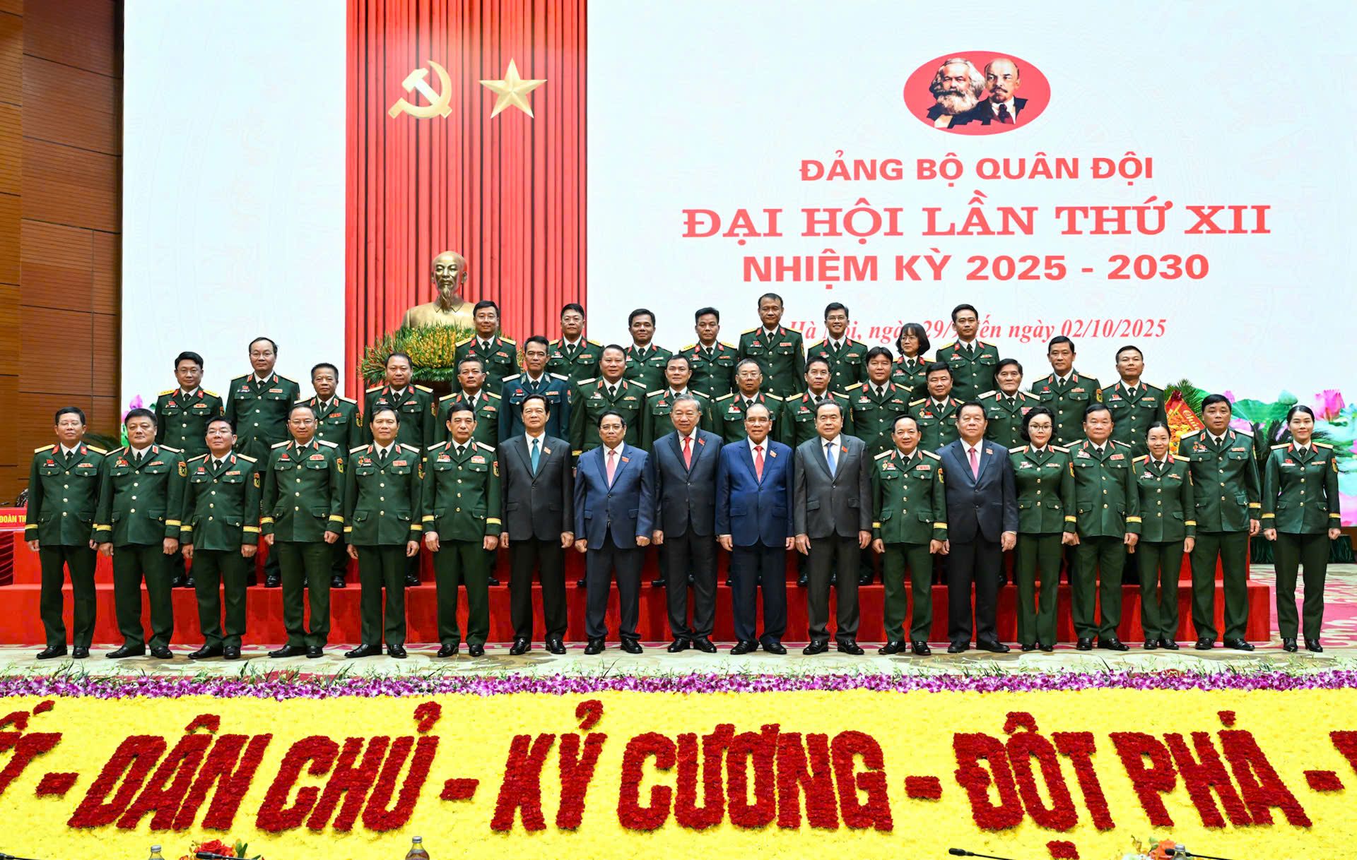 Đại hội đại biểu Đảng bộ Quân đội lần thứ 12, nhiệm kỳ 2025 - 2030 là dấu mốc đặc biệt quan trọng đối với sự nghiệp xây dựng Quân đội nhân dân Việt Nam, củng cố quốc phòng, bảo vệ Tổ quốc. Thay mặt lãnh đạo Đảng, Nhà nước, tôi trân trọng gửi tới các đồng chí lãnh đạo, nguyên lãnh đạo Đảng, Nhà nước, Quân ủy Trung ương, Bộ Quốc phòng; lãnh đạo các ban, bộ, ngành Trung ương và các địa phương; 448 đại biểu tiêu biểu về bản lĩnh, trí tuệ, niềm tin và ý chí của Đảng bộ Quân đội về dự Đại hội, cùng toàn thể cán bộ, chiến sĩ toàn quân và lực lượng dân quân tự vệ cả nước những tình cảm thân thiết và lời chúc mừng tốt đẹp nhất. Chúc Đại hội của chúng ta thành công tốt đẹp.