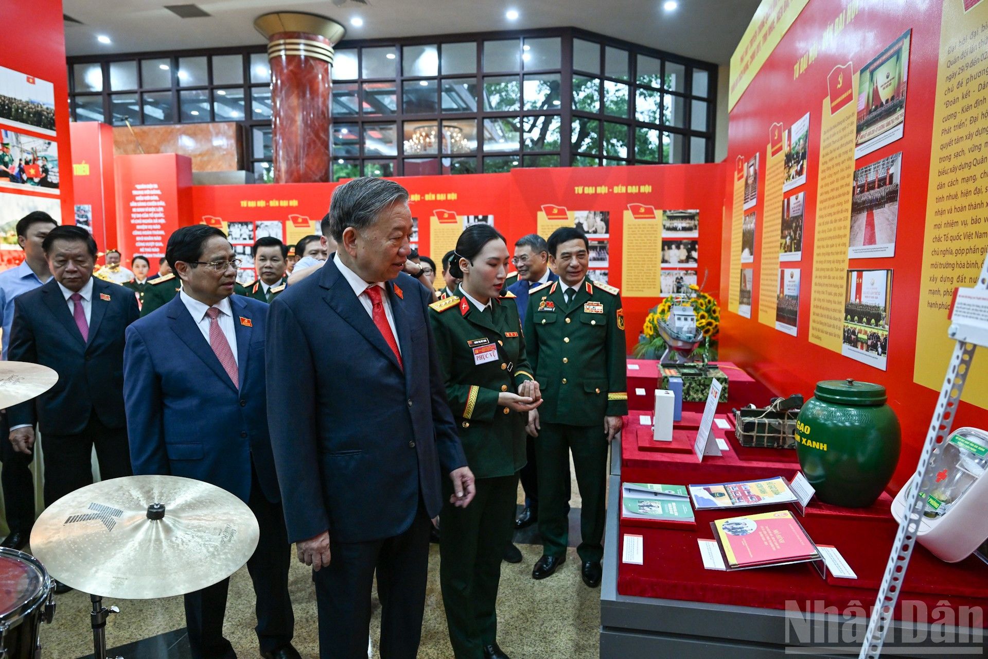 Tổng Bí thư Tô Lâm cùng các đồng chí lãnh đạo Đảng, Nhà nước tham quan trưng bày thành tựu của lực lượng Quân đội tại Đại hội.