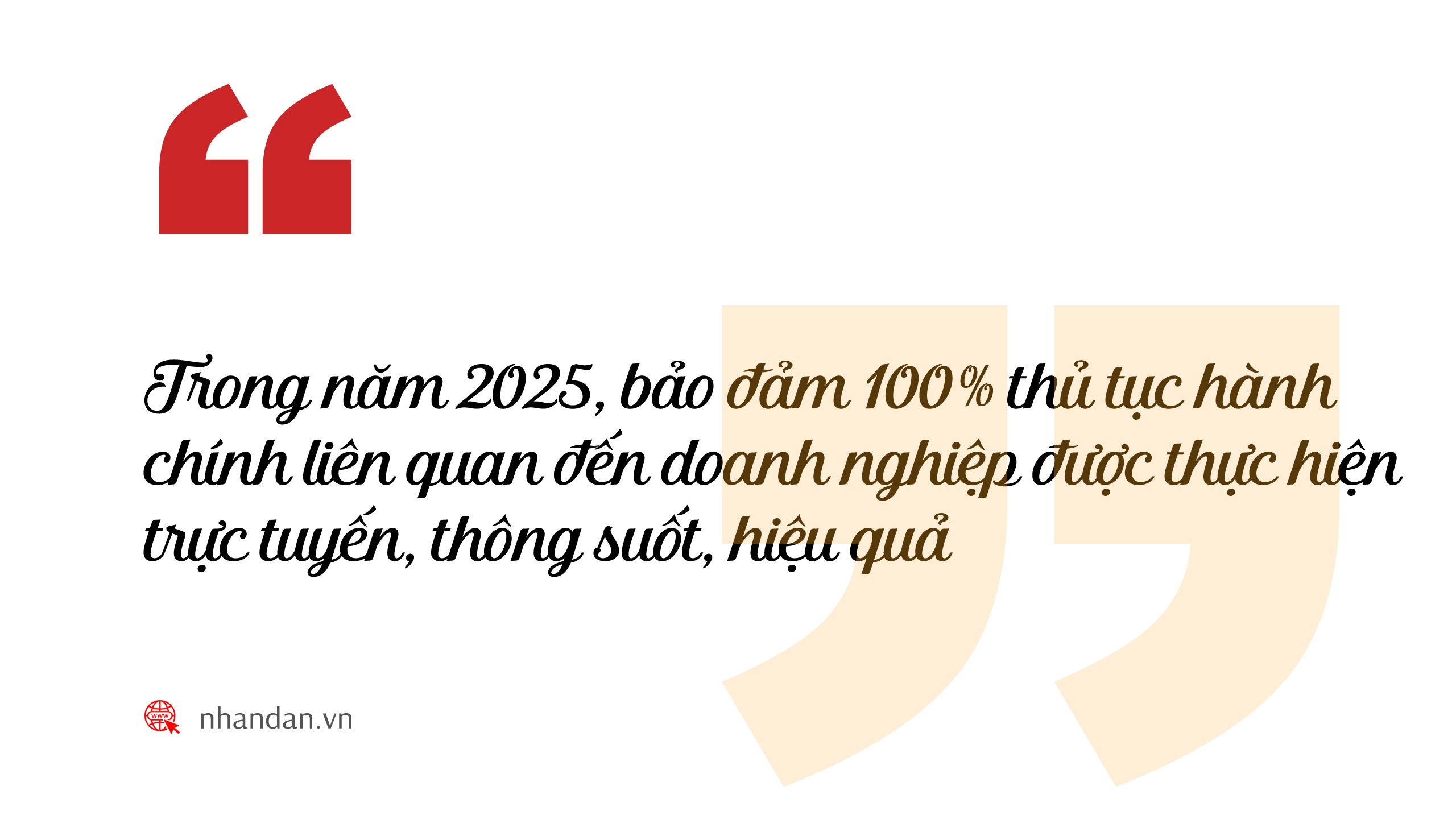 Trong năm 2025, bảo đảm 100% thủ tục hành chính liên quan đến doanh nghiệp được thực hiện trực tuyến, thông suốt, hiệu quả; 100% thủ tục hành chính không bị giới hạn bởi địa giới hành chính cấp tỉnh. Đẩy nhanh kết nối và chia sẻ dữ liệu quan trọng trong các lĩnh vực như dân cư, tư pháp, giáo dục, ngân hàng, thuế, bảo hiểm, doanh nghiệp, đất đai, phương tiện... Trung tâm dữ liệu quốc gia phải hoàn thành với dữ liệu “đúng, đủ, sạch, sống,” dẫn dắt chuyển đổi số toàn diện, tạo nền tảng phát triển kinh tế số và lực lượng sản xuất hiện đại giai đoạn 2026-2030, đáp ứng mục tiêu Nghị quyết 57.