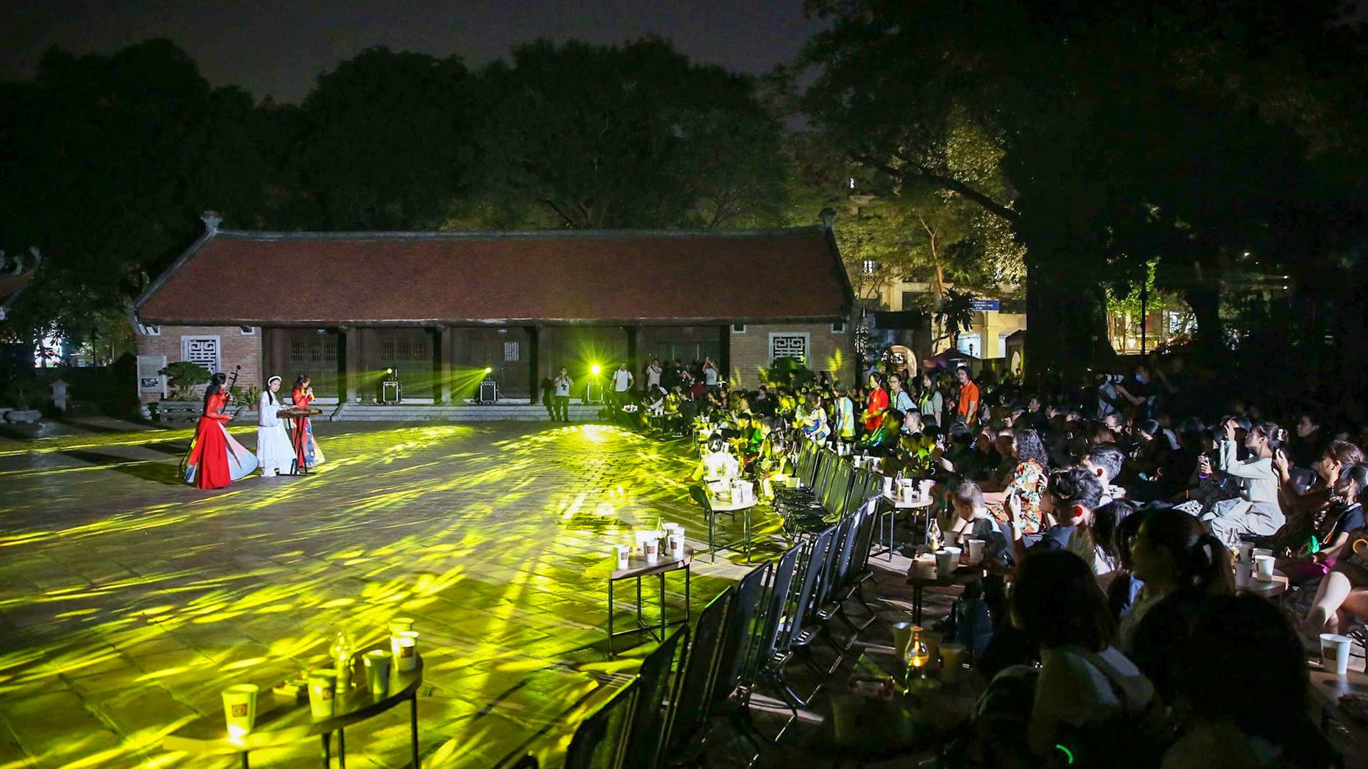 Khách du lịch trải nghiệm chương trình “Tour đêm Văn Miếu-Quốc Tử Giám”. (Ảnh: THÀNH NGUYỄN)