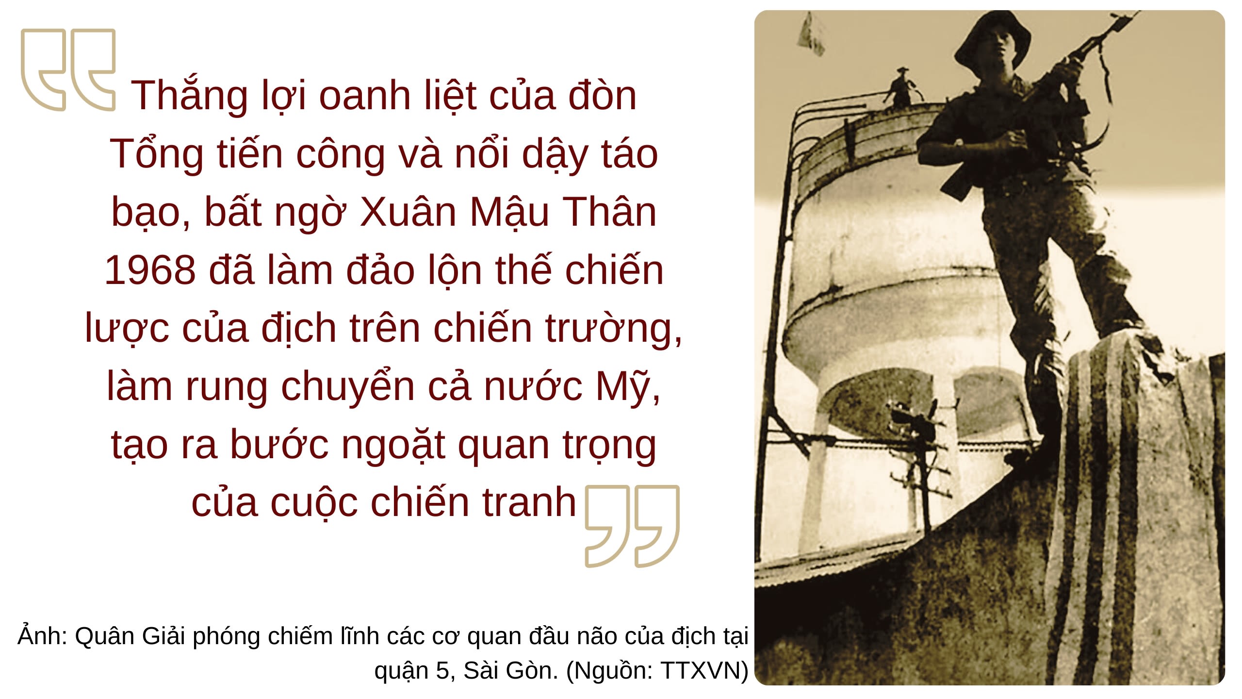 Thắng lợi oanh liệt của đòn Tổng tiến công và nổi dậy táo bạo, bất ngờ Xuân Mậu Thân 1968 đã làm đảo lộn thế chiến lược của địch trên chiến trường, làm rung chuyển cả nước Mỹ, tạo ra bước ngoặt quan trọng của cuộc chiến tranh, đánh dấu sự phá sản của chiến lược "chiến tranh cục bộ", làm lung lay tận gốc ý chí xâm lược và buộc đế quốc Mỹ phải chủ trương "phi Mỹ hóa" chiến tranh, chấm dứt chiến tranh phá hoại miền bắc không điều kiện, chấp nhận đàm phán trực tiếp với ta tại Hội nghị Paris, khởi đầu một quá trình đi xuống về chiến lược của Mỹ và đó là quá trình không thể đảo ngược.