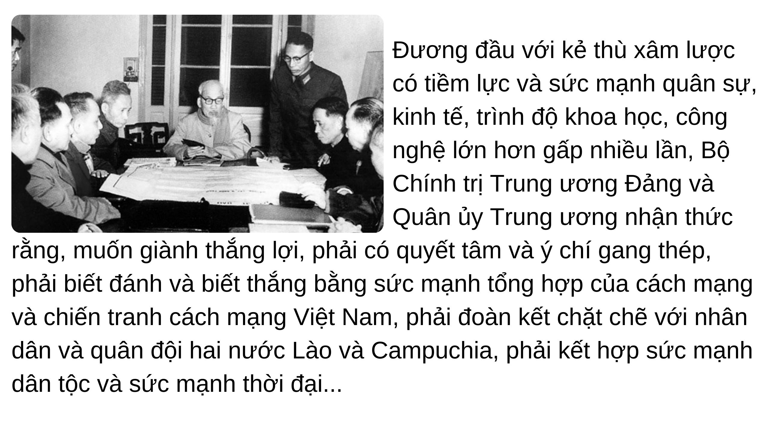 Ðương đầu với kẻ thù xâm lược có tiềm lực và sức mạnh quân sự, kinh tế, trình độ khoa học, công nghệ lớn hơn gấp nhiều lần, Bộ Chính trị Trung ương Ðảng và Quân ủy Trung ương nhận thức rằng, muốn giành thắng lợi, phải có quyết tâm và ý chí gang thép, phải biết đánh và biết thắng bằng sức mạnh tổng hợp của cách mạng và chiến tranh cách mạng Việt Nam, phải đoàn kết chặt chẽ với nhân dân và quân đội hai nước Lào và Campuchia, phải kết hợp sức mạnh dân tộc và sức mạnh thời đại...