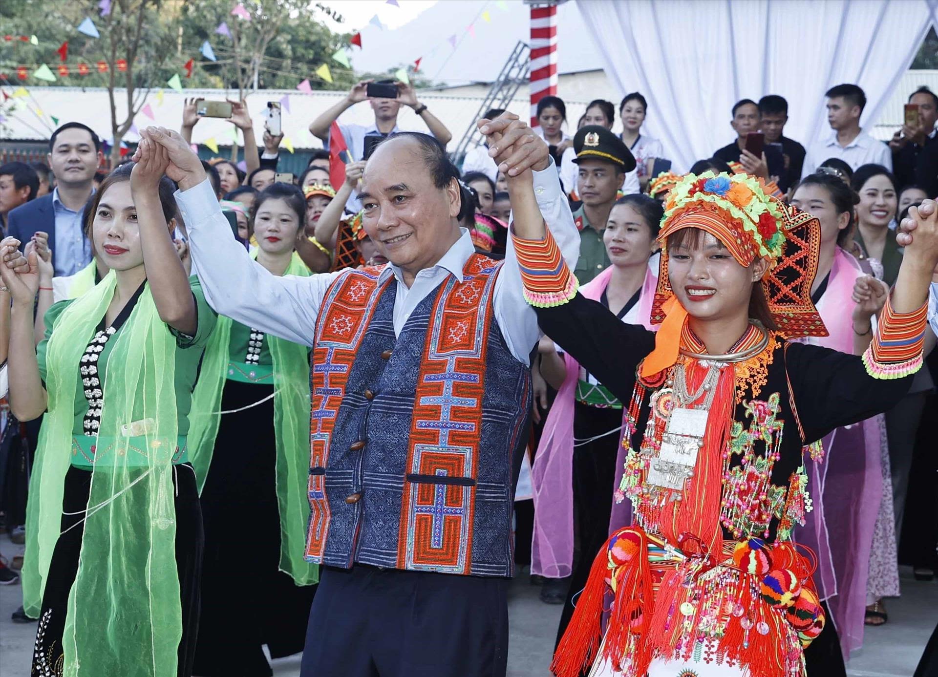 Президент Нгуен Суан Фук принимает участие в церемонии празднования Дня Великого национального единства в объединенном жилом районе общин Кхонглао, Мыонгшо и Хоангтхен уезда Фонгтхо провинции Лайтяу, 11 ноября 2022 года. Фото: ВИА