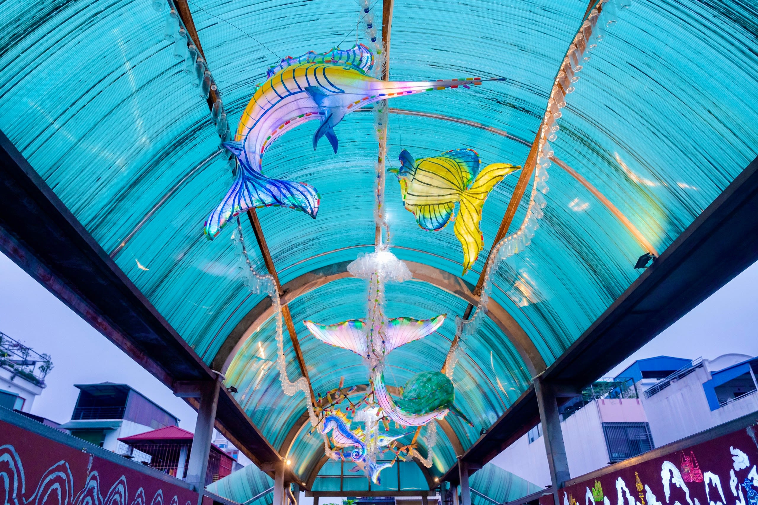 Furthermore, Hoan Kiem has transformed many public spaces into creative spaces. Following Phung Hung Street Mural Space and Phuc Tan Street Art Space (Red River Art Street), the pedestrian bridge across Tran Nhat Duat Street has become a cultural space. Passing the bridge, the public can enjoy the Hang Trong painting with the theme "Leaping Over the Dragon's Gate" — a painting symbolising overcoming difficulties to achieve success, especially passing the examinations; or walking in an aquarium "tunnel" with fish "swimming" above with the work "Thuy Cung" (Aquarium).