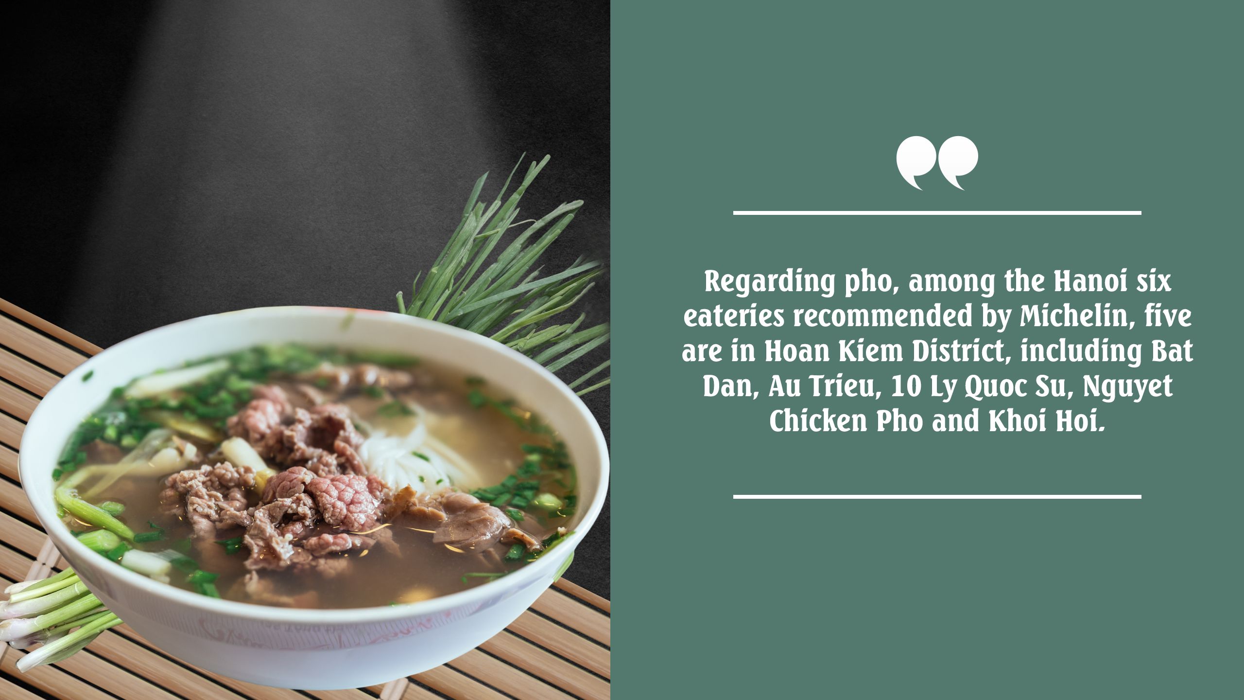 One notable thing is that Hanoi’s restaurants honoured by Michelin are primarily located in Hoan Kiem District. Regarding pho, among the Hanoi six eateries recommended by Michelin, five are in Hoan Kiem District.