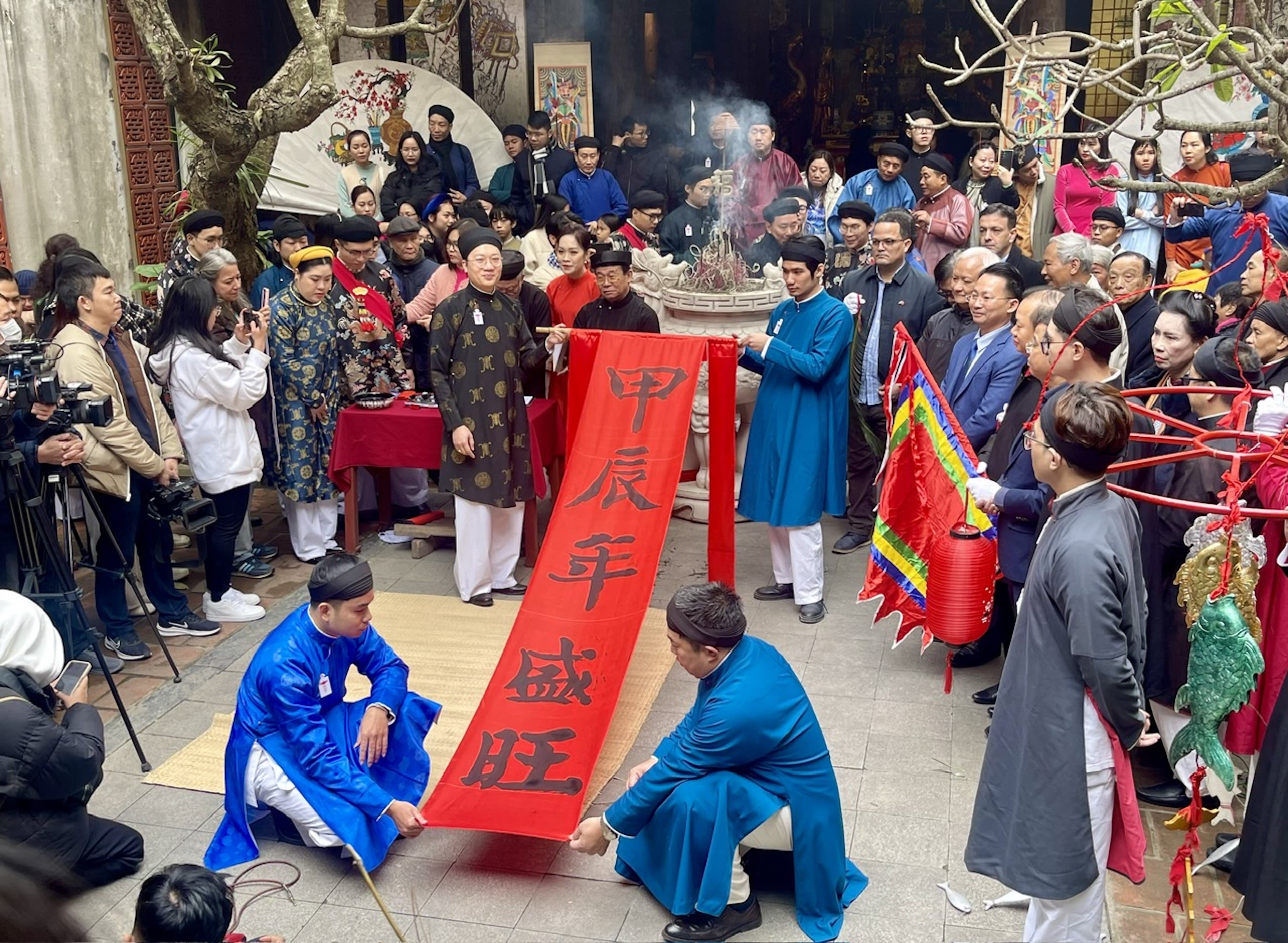 Tu Thi Communal House (Yen Thai Street) introduces artifacts and images about the birth and development of embroidery; traditional embroidery techniques, works of art applying embroidery techniques. Pha Truc Lam Communal House (Hang Hanh Street) inspires artists to create works related to the leather shoe industry and ancient shoes. Nam Huong Communal House located on Hang Trong Street has become an address to introduce Hang Trong folk paintings, works of artists inspired by Hang Trong folk paintings using many different materials: Lacquer, silk, gold-plated paintings and even hand embroidery.