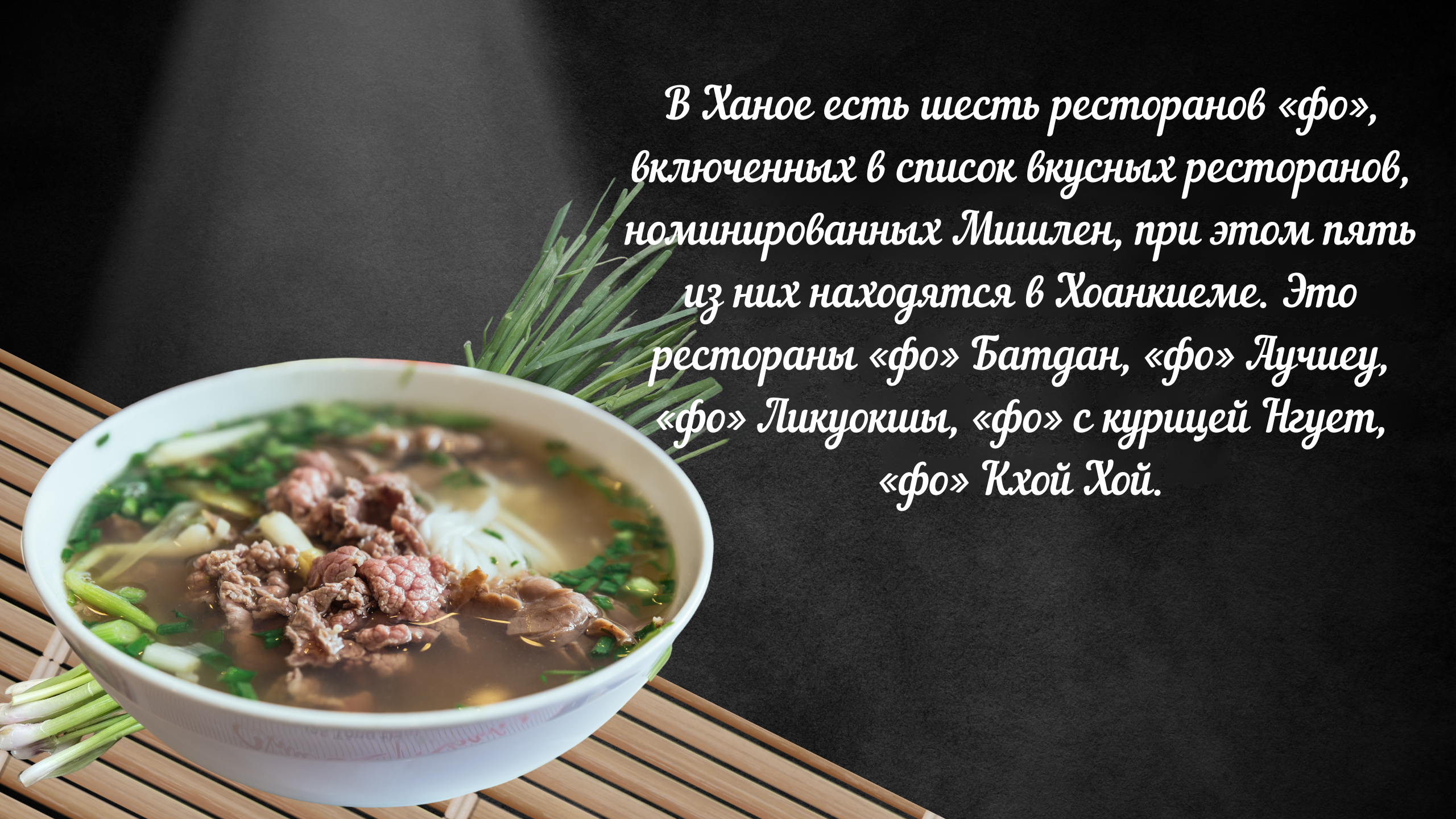 В Ханое есть шесть ресторанов «фо», включенных в список вкусных ресторанов, номинированных Мишлен, при этом пять из них находятся в Хоанкиеме. Это рестораны «фо» Батдан, «фо» Аучиеу, «фо» Ликуокшы, «фо» с курицей Нгует, «фо» Кхой Хой.