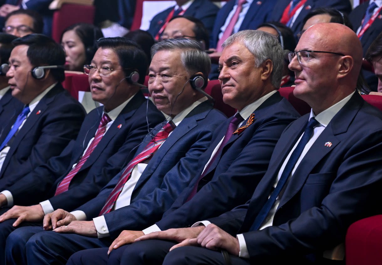 Tổng Bí thư Tô Lâm và Chủ tịch Duma Quốc gia (Hạ viện) Liên bang Nga Vyacheslav Volodin cùng các đại biểu dự buổi gặp gỡ và phát biểu Chính sách tại Học viện Hành chính Công và Kinh tế quốc dân trực thuộc Tổng thống LB Nga.