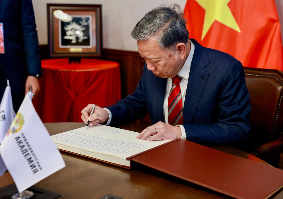 Tổng bí thư Tô Lâm viết sổ lưu niệm tại Học viện Hành chính Công và Kinh tế quốc dân trực thuộc Tổng thống LB Nga (Ranepa).
