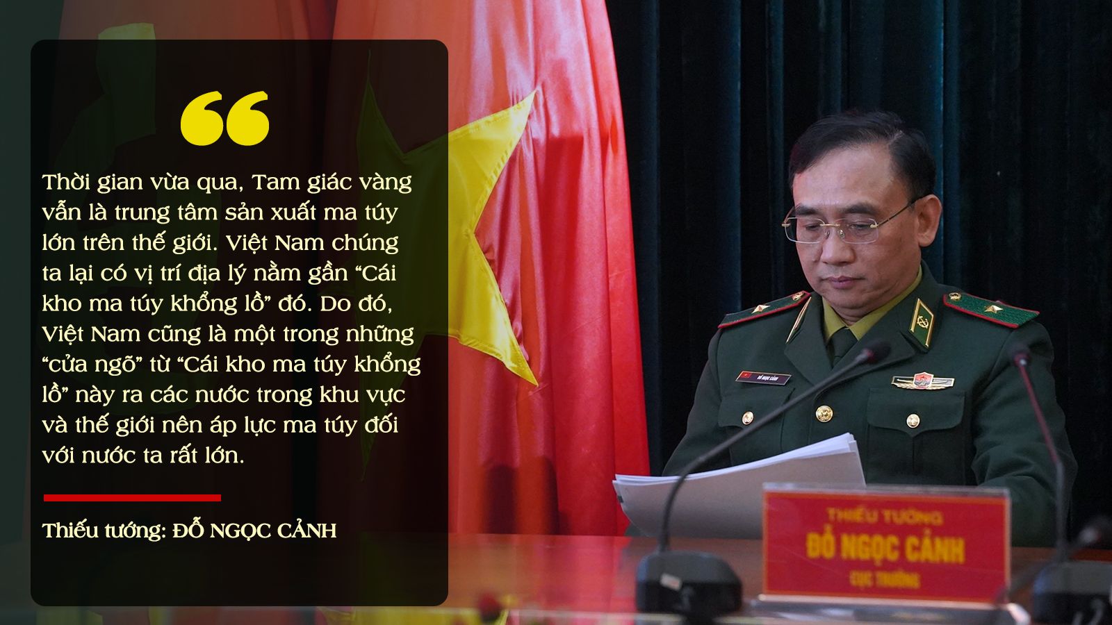 Thiếu tướng Đỗ Ngọc Cảnh: Thời gian tới, khu vực “Tam giác vàng” vẫn là trung tâm sản xuất ma túy lớn của thế giới; các tổ chức tội phạm ma túy quốc tế sử dụng công nghệ mới để sản xuất trái phép chất ma túy, tăng khối lượng, hạ giá thành, hình thành nhiều đường dây vận chuyển ma túy từ khu vực “Tam giác vàng” qua các nước láng giềng vào Việt Nam và tiếp tục trung chuyển đi nước thứ ba tiêu thụ.
