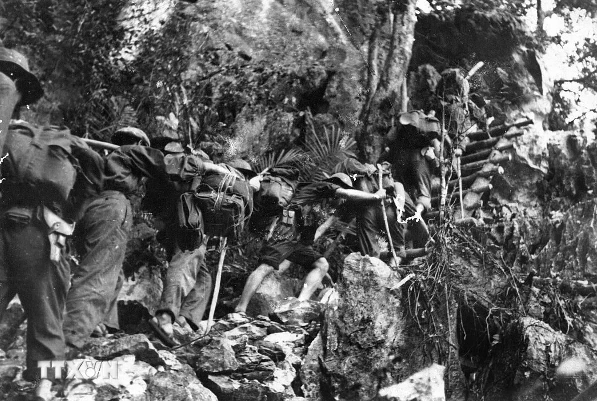 Các chiến sĩ của Trung đoàn 70, đơn vị đầu tiên của Bộ đội Trường Sơn, đang thồ hàng trên tuyến Tây Trường Sơn tháng 9/1961. (Ảnh: Tư liệu BTC/TTXVN phát)