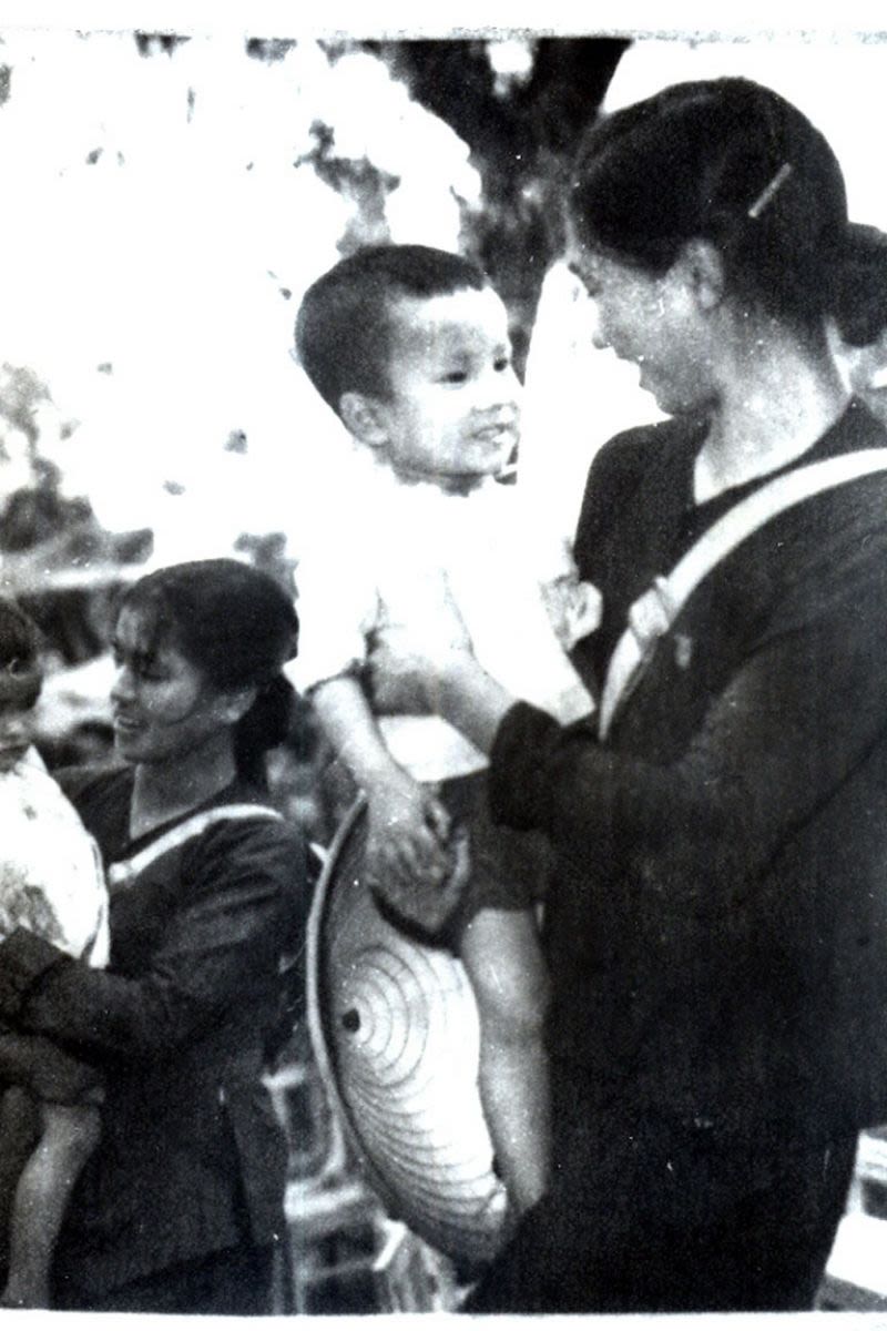 Nữ dân quân ngoại thành Hà Nội đón con sau giờ trực chiến.