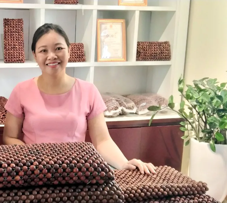 Chị Cao Thị Tâm và quầy giới thiệu sản phẩm.