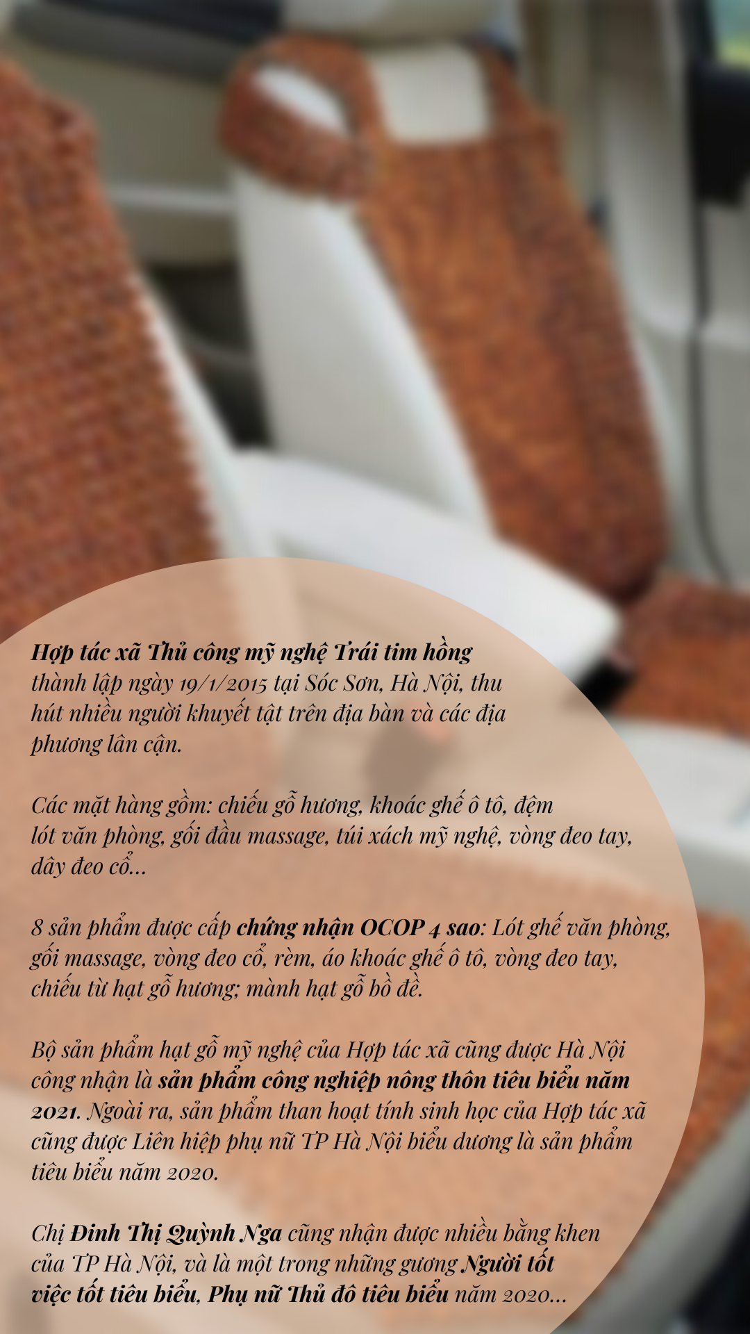 Lần đầu tiên gặp chị trong Hội nghị tuyên dương các sản phẩm OCOP Hà Nội, tôi đặc biệt chú ý đến người phụ nữ nhỏ nhắn, không thể đứng thẳng bình thường nhưng có khuôn mặt phúc hậu và đôi mắt sáng đầy nghị lực. Chị chính là Đinh Thị Quỳnh Nga, Chủ tịch Hội đồng quản trị, Giám đốc Hợp tác xã Trái tim hồng (Sóc Sơn, Hà Nội).