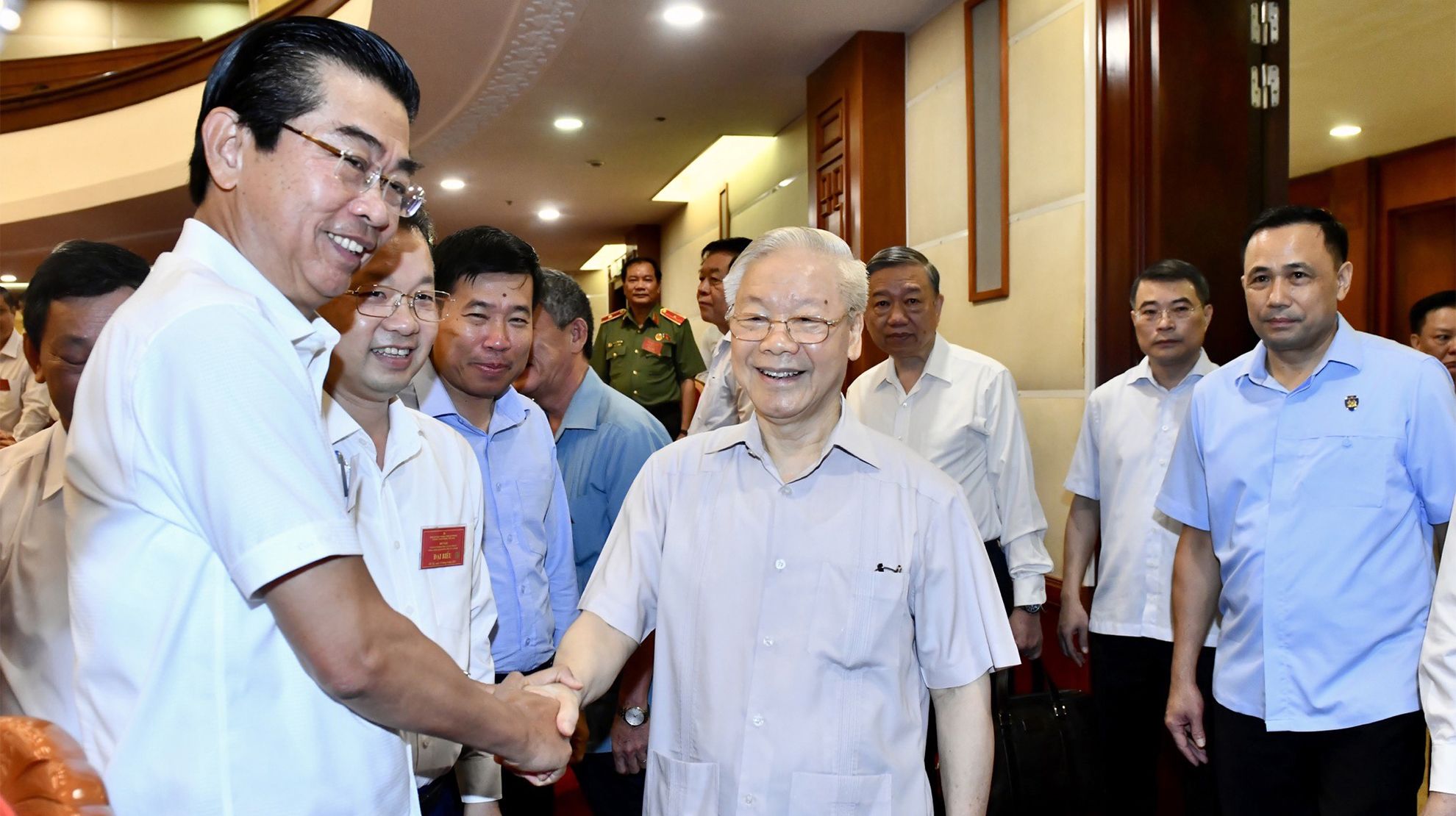 Tổng Bí thư Nguyễn Phú Trọng và các đồng chí lãnh đạo Đảng, Nhà nước dự hội nghị. Ảnh: ĐĂNG KHOA