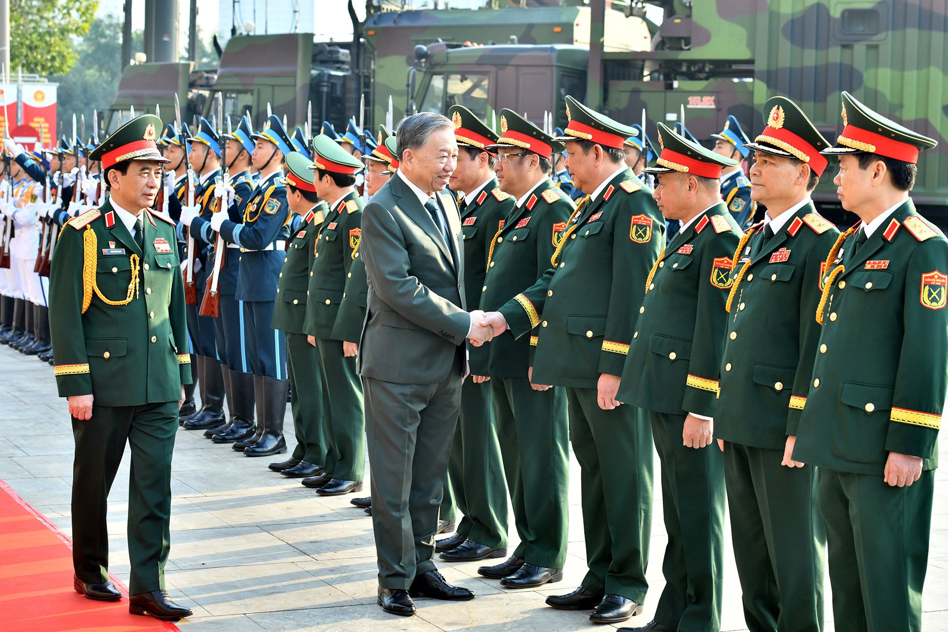 Le Secrétaire général To Lam avec les dirigeants de la Commission militaire centrale et du ministère de la Défense nationale lors de la cérémonie commémorant le 80ᵉ anniversaire de la fondation de l’Armée populaire du Vietnam.