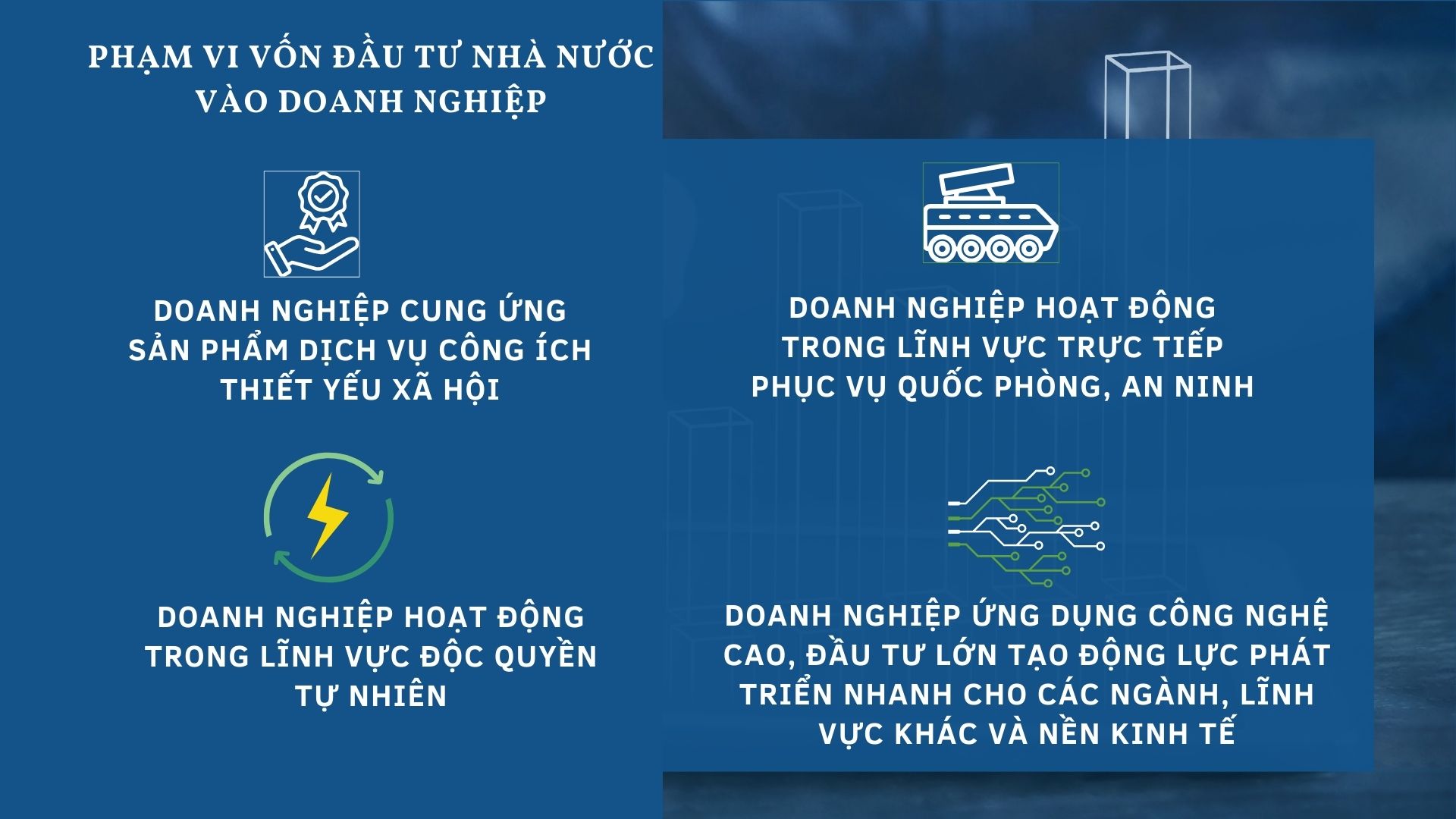 Về đầu tư vốn nhà nước vào doanh nghiệp, có thể thấy, phạm vi đầu tư vốn nhà nước vào doanh nghiệp trong thời gian qua đã thu hẹp, không còn dàn trải và được sắp xếp theo hướng tập trung đầu tư. Theo đó, nguồn vốn này được đưa vào 4 lĩnh vực: doanh nghiệp cung ứng sản phẩm dịch vụ công ích thiết yếu xã hội; doanh nghiệp hoạt động trong lĩnh vực trực tiếp phục vụ quốc phòng, an ninh; doanh nghiệp hoạt động trong lĩnh vực độc quyền tự nhiên; doanh nghiệp ứng dụng công nghệ cao, đầu tư lớn tạo động lực phát triển nhanh cho các ngành, lĩnh vực khác và nền kinh tế.