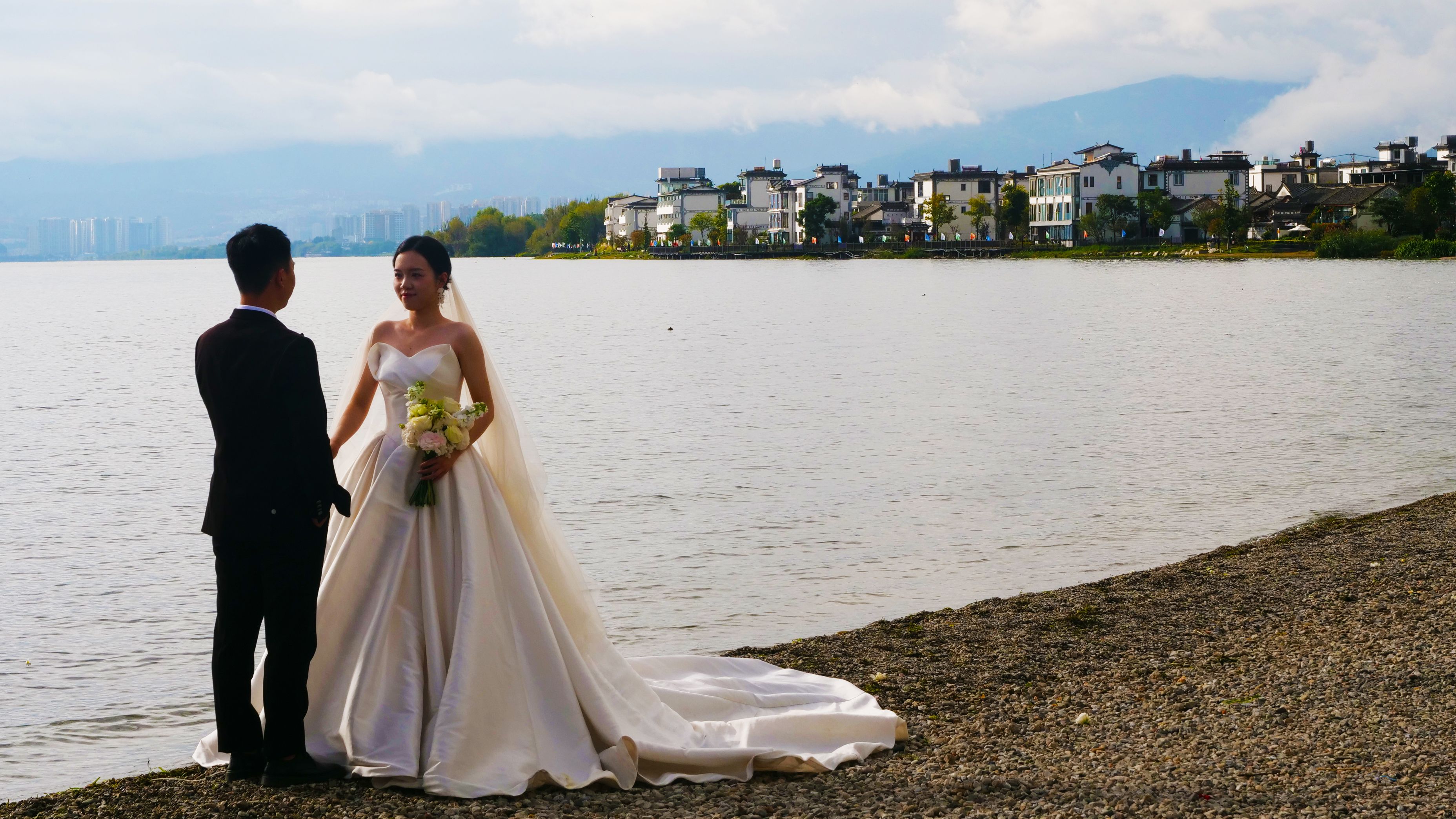 Đôi bạn trẻ Trung Quốc chụp ảnh cưới tại bên hồ Nhĩ Hải, thành phố Đại Lý, tỉnh Vân Nam, Trung Quốc.
