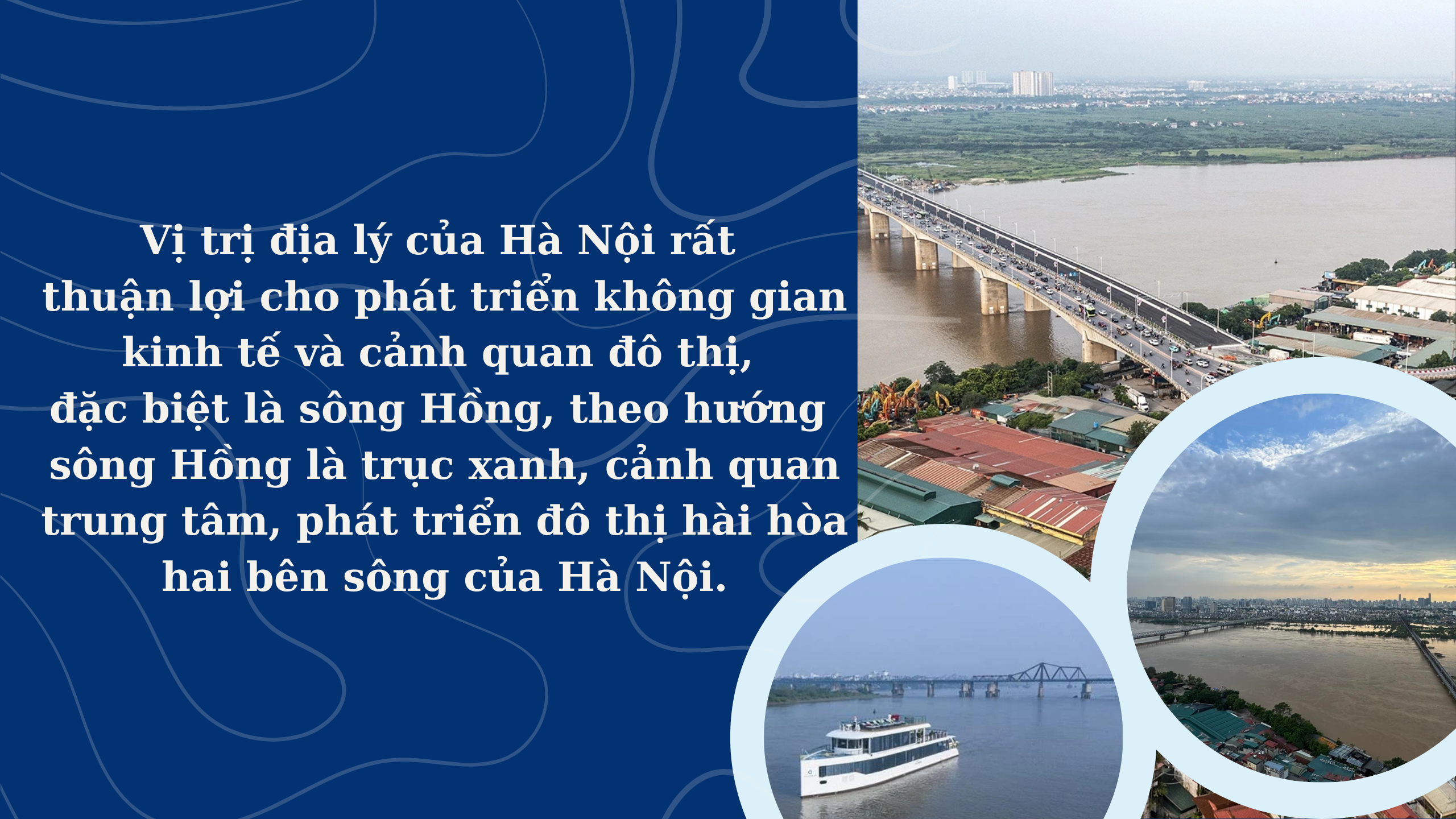 Mặt khác, vị trị địa lý của Hà Nội rất thuận lợi cho phát triển không gian kinh tế và cảnh quan đô thị, đặc biệt là sông Hồng, theo hướng sông Hồng là trục xanh, cảnh quan trung tâm, phát triển đô thị hài hòa hai bên sông của Hà Nội, để sông Hồng thật sự trở thành một trục cảnh quan thiên nhiên, dòng chảy lịch sử tạo nên dấu ấn của nền văn hóa Thăng Long và góp phần làm nên một Hà Nội văn hiến, khi kết hợp trục sông Hồng với trục Ba Vì-Hồ Tây thành trục văn hóa sẽ làm nên một Hà Nội riêng khác, đặc trưng. Xây dựng mô hình thành phố trực thuộc Thủ đô tại khu vực phía bắc (vùng Đông Anh, Mê Linh, Sóc Sơn) và phía tây (vùng Hoà Lạc, Xuân Mai).