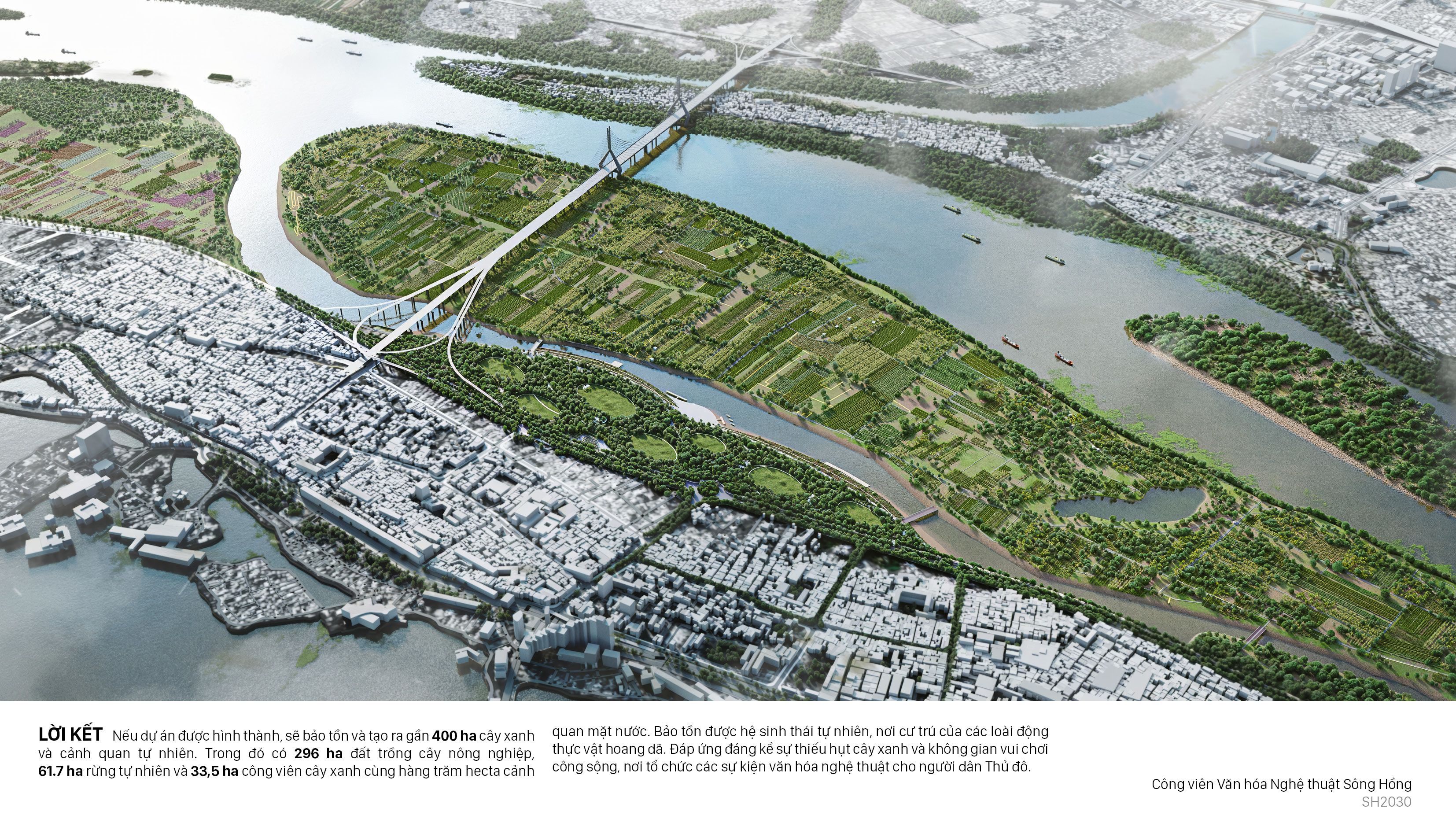 Qua đợt bão vừa rồi, chúng ta có thể thấy Hà Nội rất cần thêm các không gian xanh ở khu vực sông Hồng. Với dự án, chúng tôi đã tính toán tất cả yếu tố công trình, hạng mục hạ tầng đến cấp độ lũ số 2, tương đương mực nước là 11,5m. Trong phương án chúng tôi đưa ra toàn bộ khu vực giữa sông Hồng có địa hình thấp chỉ sử dụng để trồng hoa màu, canh tác nông nghiệp và kiến trúc nhà sàn 2 tầng. Tầng 1 là không gian mở, sử dụng khi không có lũ, tầng 2 là không gian kín có thể sử dụng để ở hoặc cất trữ đồ đạc khi có lũ.