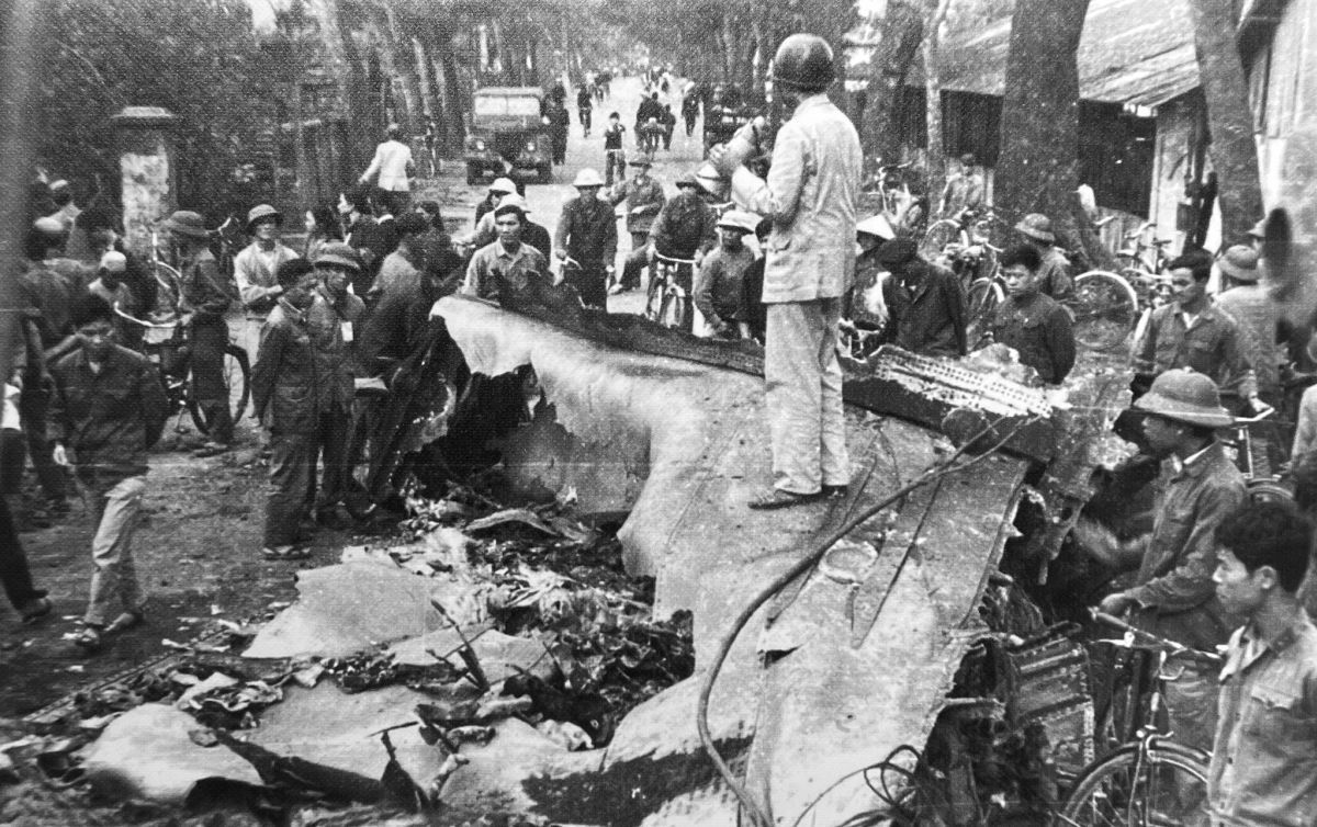 Người dân đi xem mảnh xác máy bay B-52 rơi trên đường Hoàng Hoa Thám (Ba Đình). Chiếc máy bay bị tên lửa Tiểu đoàn 72 (Trung đoàn 285) bắn hạ đêm 27/12. (Ảnh tư liệu)
