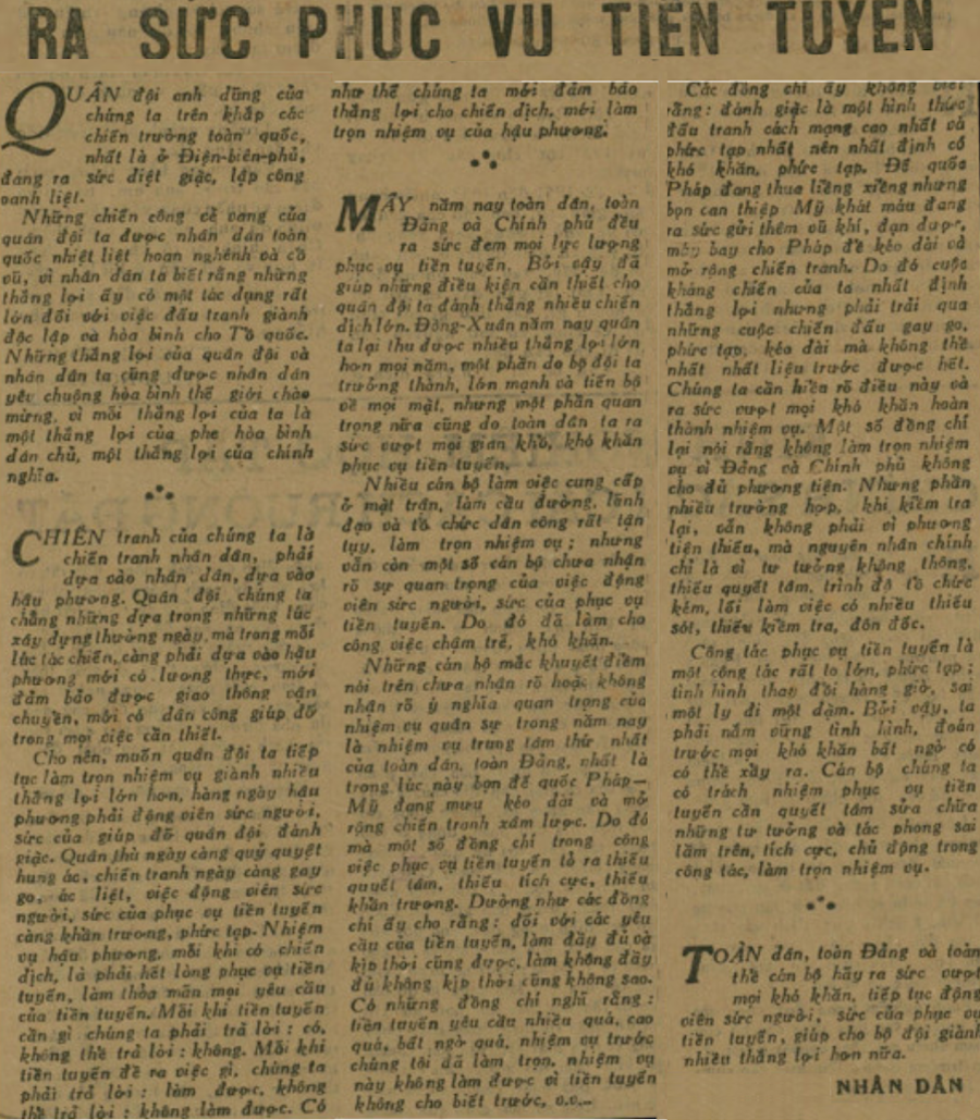 Mấy năm nay toàn dân, toàn Đảng và Chính phủ đều ra sức đem mọi lực lượng phục vụ tiền tuyến. Bởi vậy đã giúp những điều kiện cần thiết cho quân đội ta đánh thắng nhiều chiến dịch lớn. Đông Xuân năm nay quân ta lại thu được nhiều thắng lợi lớn hơn mọi năm, một phần do bộ đội ta trưởng thành, lớn mạnh và tiến bộ về mọi mặt, nhưng một phần quan trọng nữa cũng do toàn dân ta ra sức vượt mọi gian khổ, khó khăn phục vụ tiền tuyến.