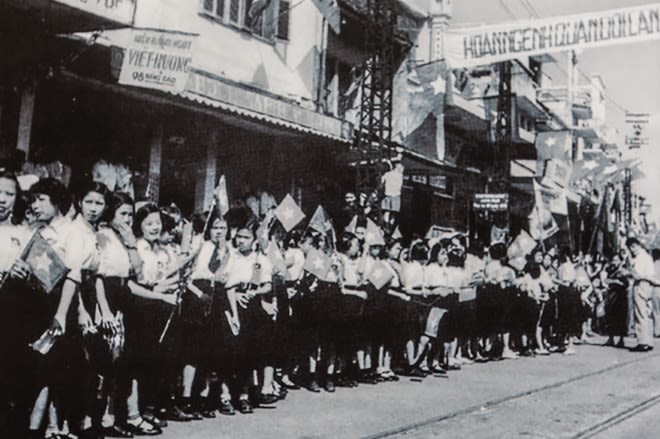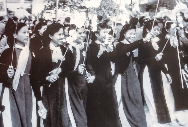 Las mujeres de Hanói desfilan para celebrar la toma de la capital. (Foto de archivo: cand.com.vn)