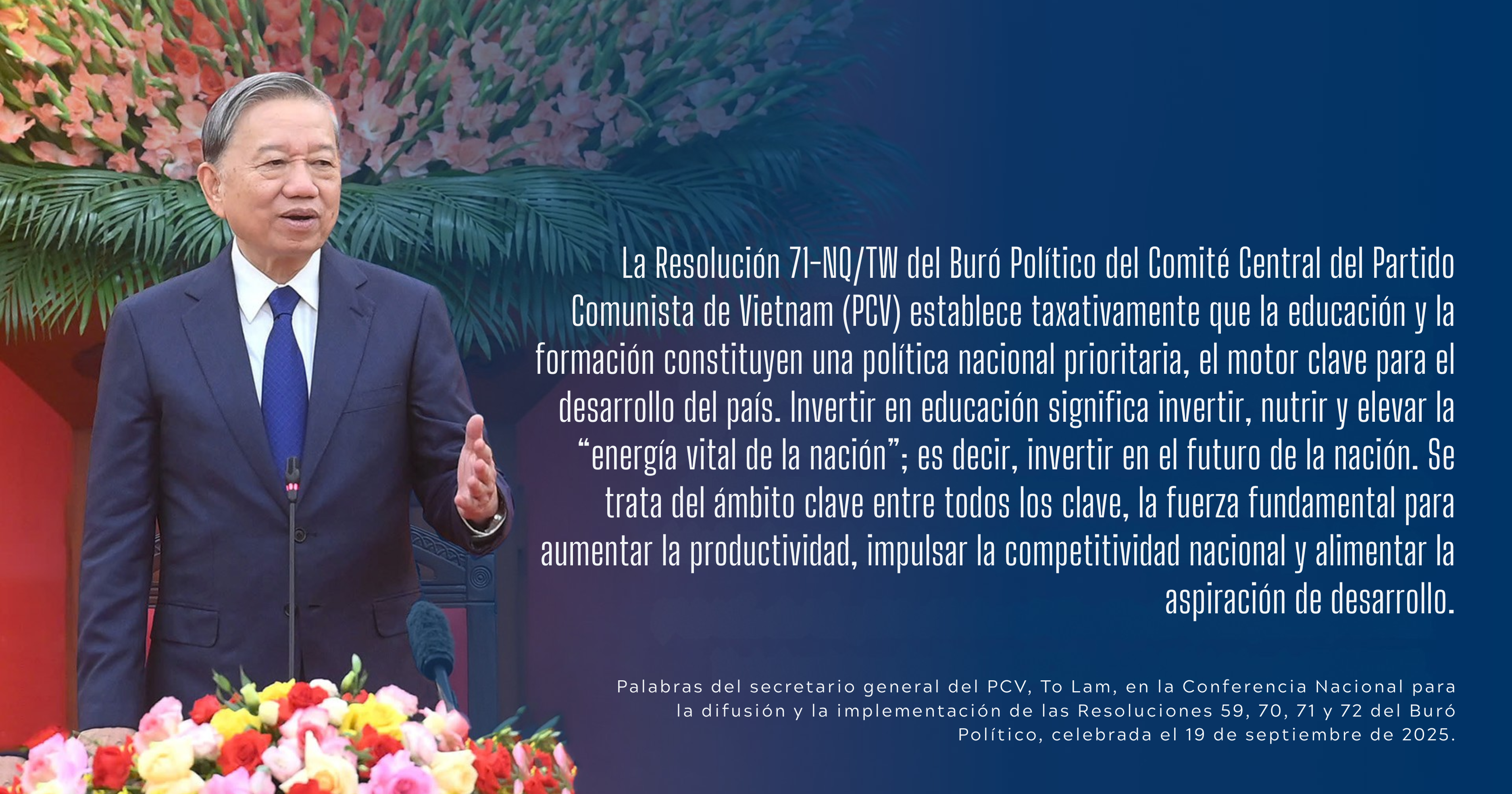 La Resolución 71-NQ/TW reafirma la profunda y plena percepción, así como la puesta en práctica coherente del principio de que la educación y la formación suponen una política nacional prioritaria y determinan el futuro de la nación. El desarrollo de la educación y la formación es una causa del Partido, del Estado y de todo el pueblo. El Estado desempeña un papel fundamental en la definición de las orientaciones estratégicas, creador de condiciones para el desarrollo, garante de los recursos y de la equidad en la educación; asegura la existencia de suficientes centros educativos, aulas y docentes para satisfacer las necesidades de aprendizaje de los ciudadanos. Toda la sociedad es responsable de cuidar, contribuir con recursos y supervisar el desarrollo de la educación.