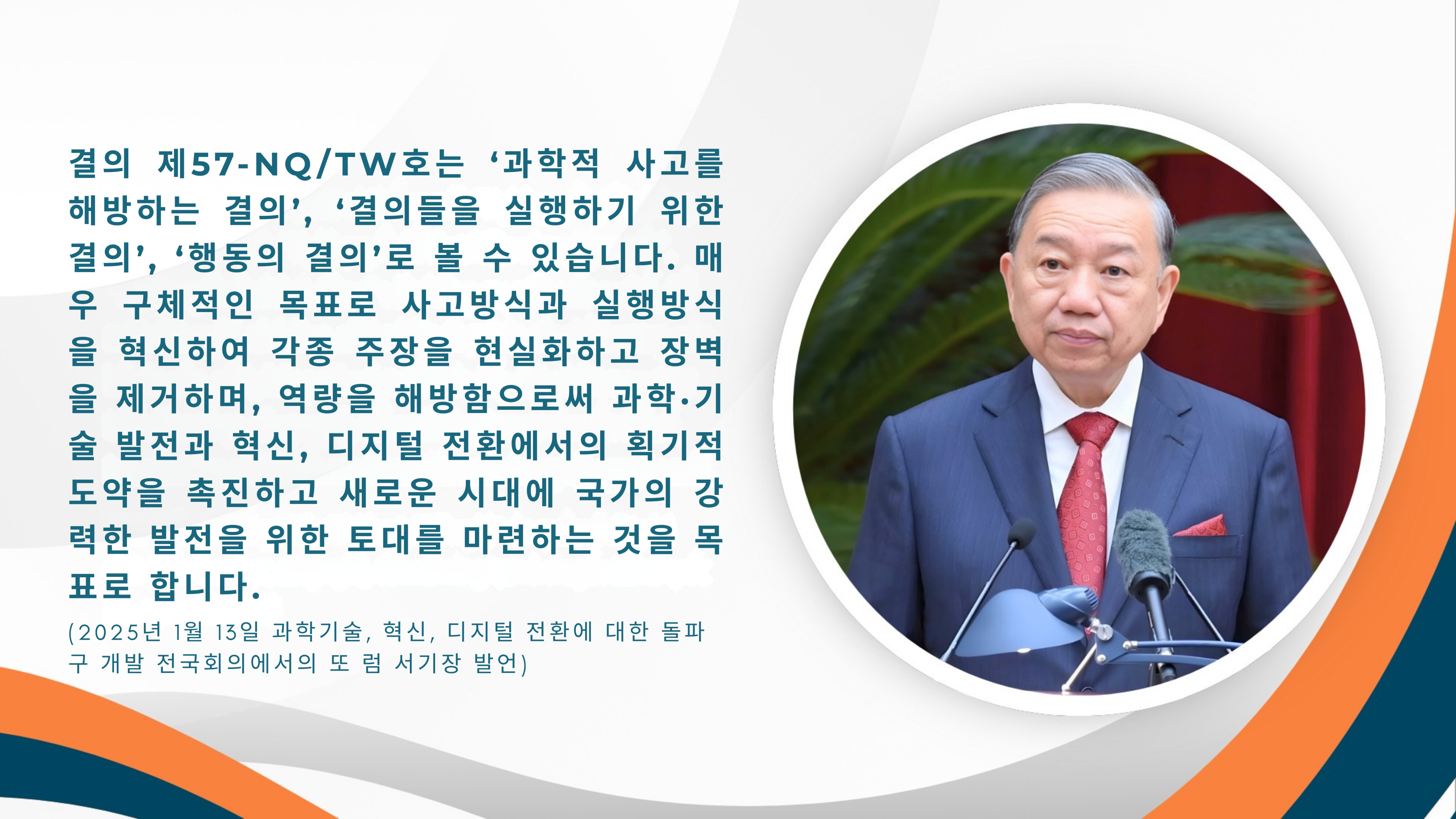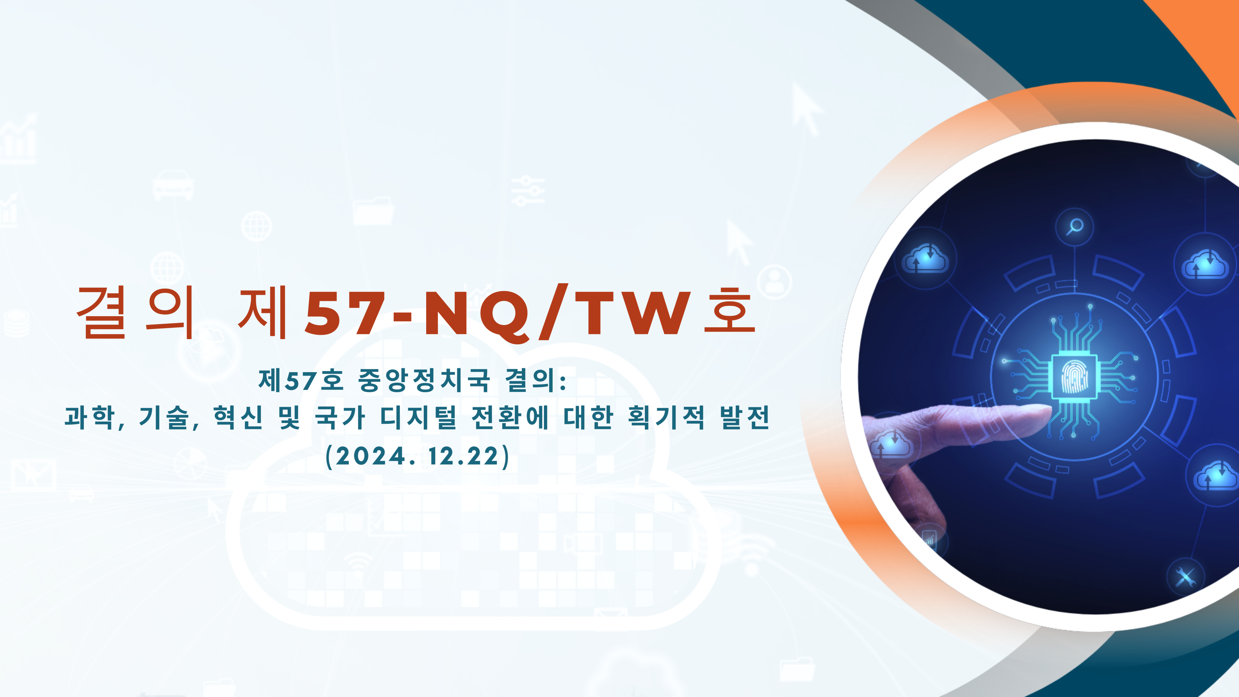 결의 제57-NQ/TW호는 신성장 동력을 창출하기 위한 강력하고 전략적이고 혁명적인 방침과 정책을 제시한다. 결의는 과학, 기술, 혁신 및 디지털 전환의 획기적인 발전이 새로운 시대, 즉 번영하는 시대로 도약하기 위한 필수 전제 조건임을 확언한다. 이는 2030년까지 현대적인 산업을 갖춘 중상위 소득 국가로, 2045년까지 사회주의 지향의 고소득 선진국으로 도약한다는 목표를 성공적으로 달성하는 데 기여할 것이다.