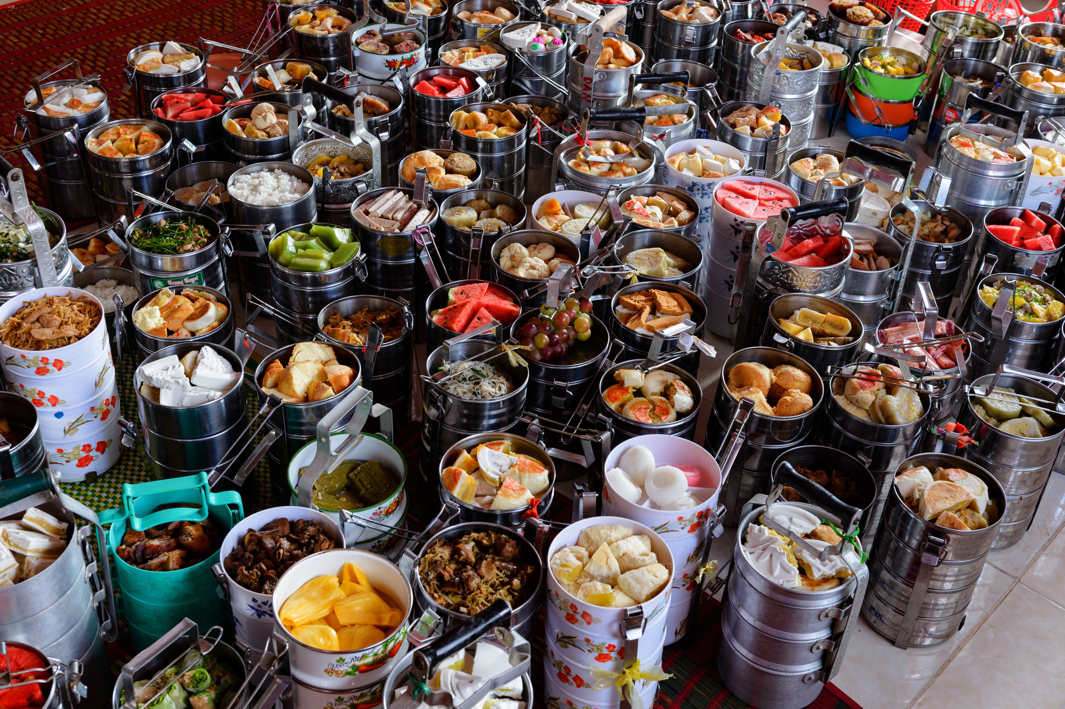 Phật tử dâng lễ vật lên chánh điện.
