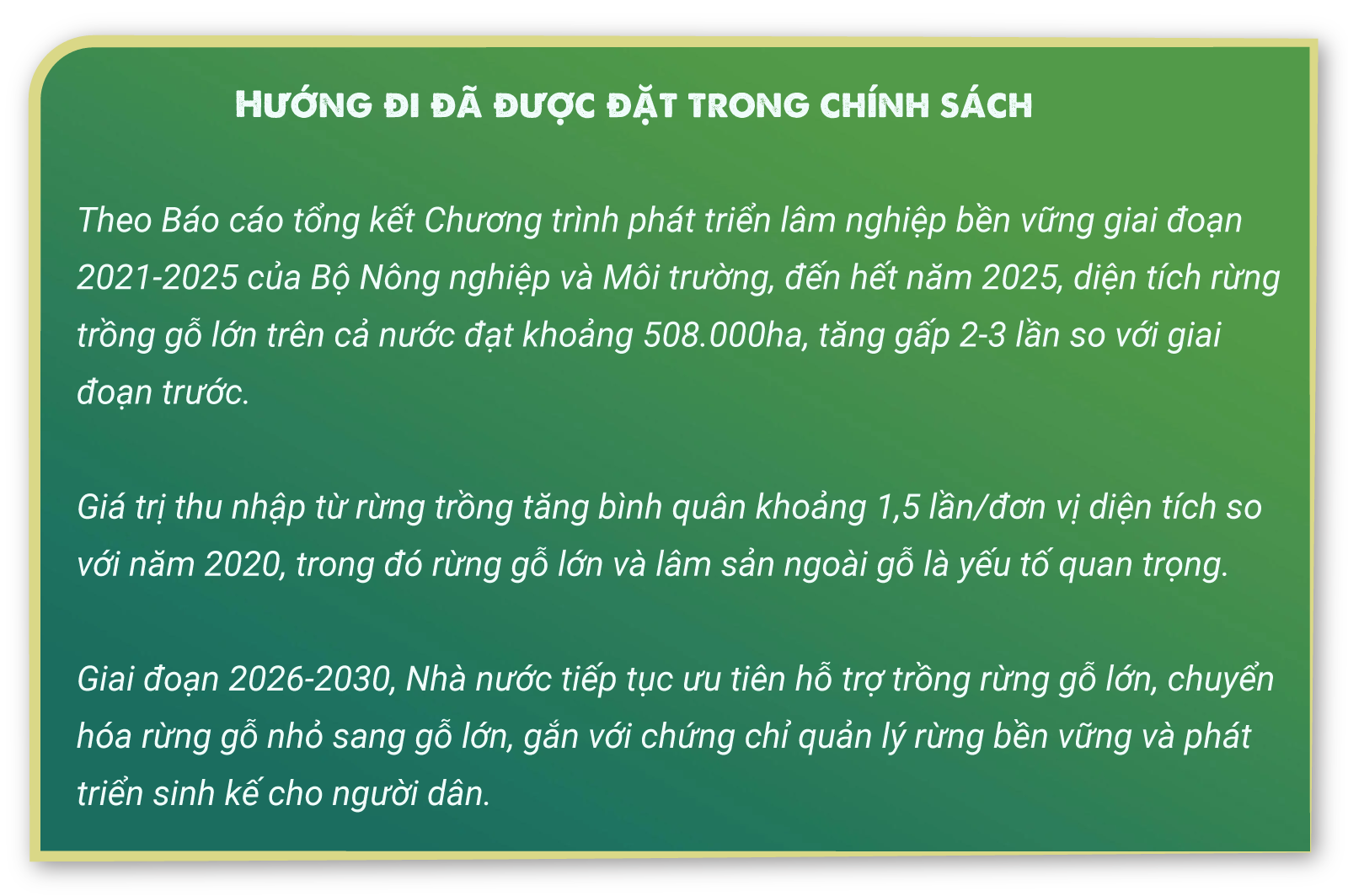 “Mô hình rừng gỗ lớn cho phép người dân sống được bằng rừng mà không phải phá rừng. Đây là điểm khác biệt căn bản so với rừng keo hay bồ đề chu kỳ ngắn”, ông Sơn nhấn mạnh. Trên cơ sở khảo nghiệm giống và theo dõi thực tế, Chi cục Kiểm lâm đã tham mưu cho địa phương hỗ trợ người dân phát triển các vùng trồng tập trung, hướng tới xây dựng vùng nguyên liệu và thương hiệu lâm sản đặc thù, tương tự như mô hình vùng chè, vùng cây ăn quả.