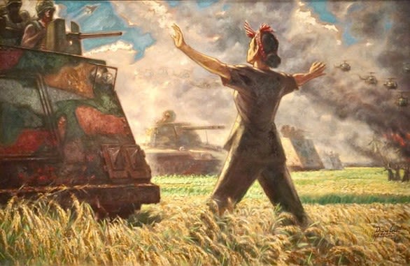 Họa sĩ Lê Lam, trong bức tranh “Dừng lại” miêu tả người phụ nữ chặn xe tăng địch, cũng dùng ánh đỏ thẫm của ngọn lửa chiến tranh để khắc họa lòng quả cảm của người dân miền nam. Trong những hoàn cảnh khốc liệt, sắc đỏ không chỉ tượng trưng cho lý tưởng mà còn là máu thịt, là hy sinh và bất khuất.