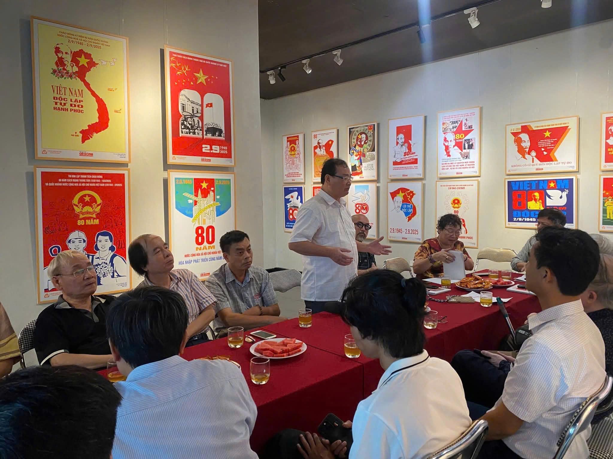 Một buổi tọa đàm về chuyên môn sáng tác tranh cổ động của các họa sĩ tại Nhà Triển lãm Mỹ thuật số 16 Ngô Quyền, Hà Nội. Ảnh: Huy Hà