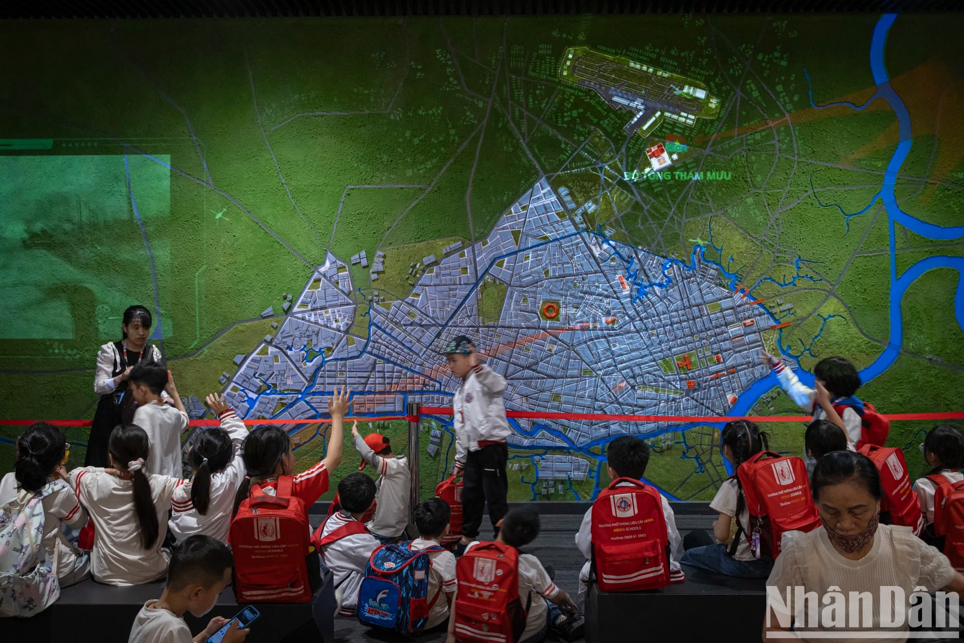 Các em học sinh thích thú trải nghiệm sa bàn Chiến dịch Hồ Chí Minh tại Bảo tàng Lịch sử Quân sự Việt Nam. (Ảnh: SƠN TÙNG)