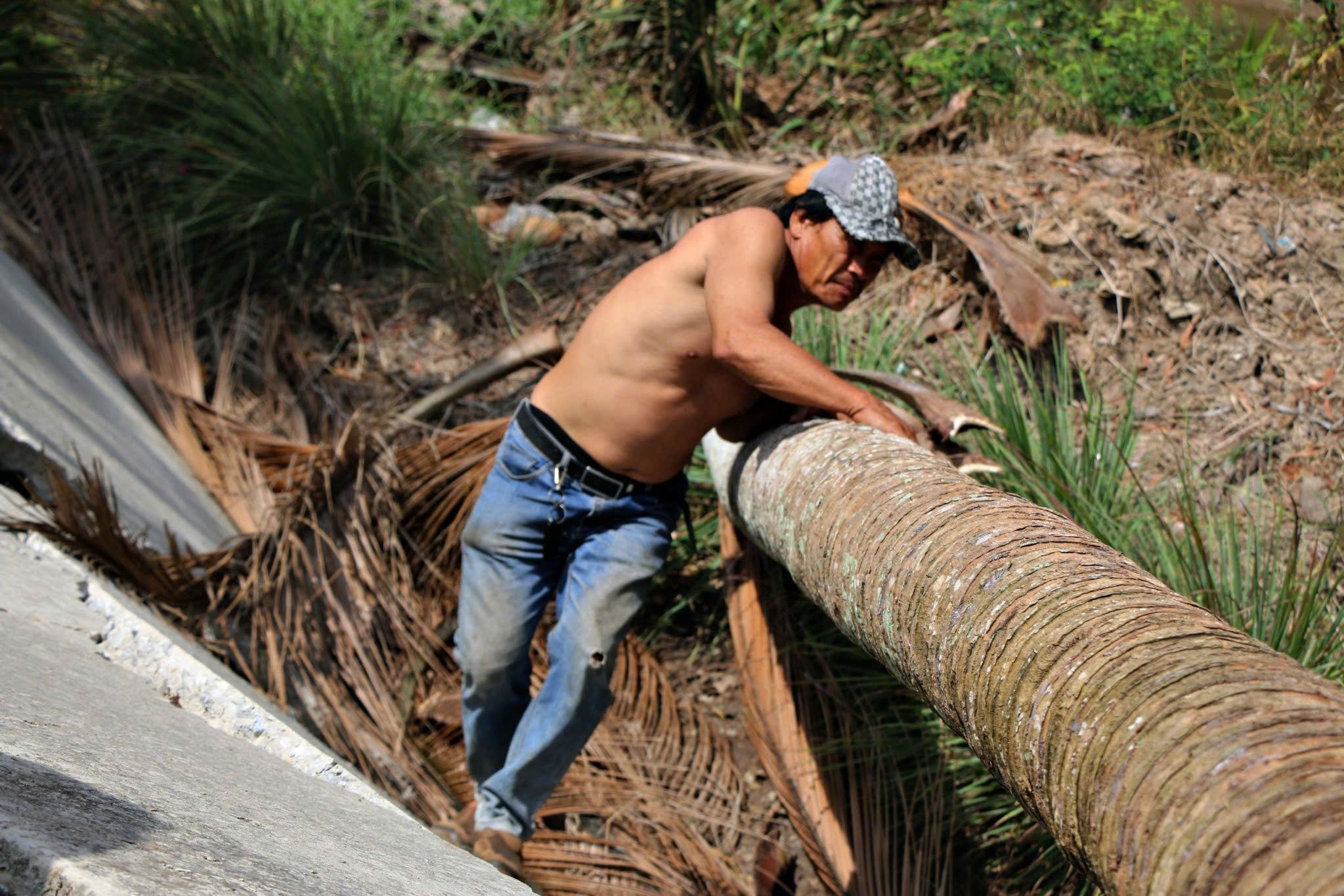 Một người đàn ông vật lộn với vùng sụt lún tại điểm hạn mặn huyện Trần Văn Thời, Cà Mau, mùa khô năm 2024. (Ảnh: Sơn Bách)
