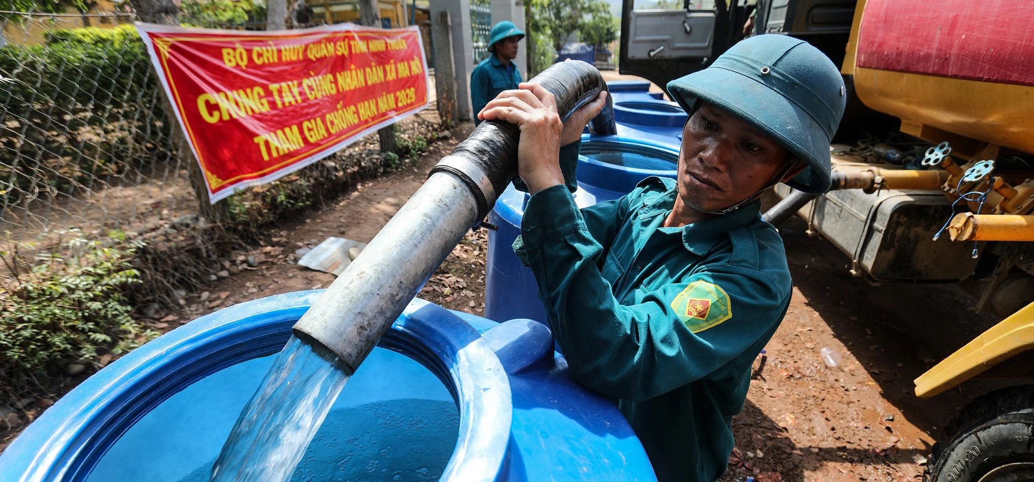 Lực lượng Bộ chỉ huy Quân sự tỉnh Ninh Thuận mang nước sạch đến cho người dân thôn Tà Nôi. Ảnh: Thành Đạt