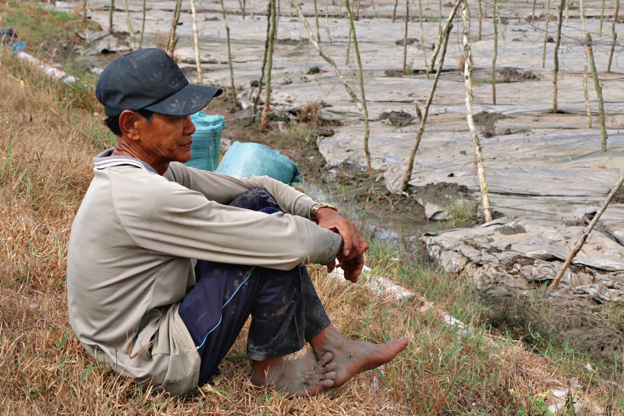 Một người đàn ông tại huyện Trần Văn Thời (Cà Mau) thẫn thờ trước mảnh ruộng hạn cháy của mình. Ảnh chụp mùa khô năm 2024. (Ảnh: Sơn Bách)