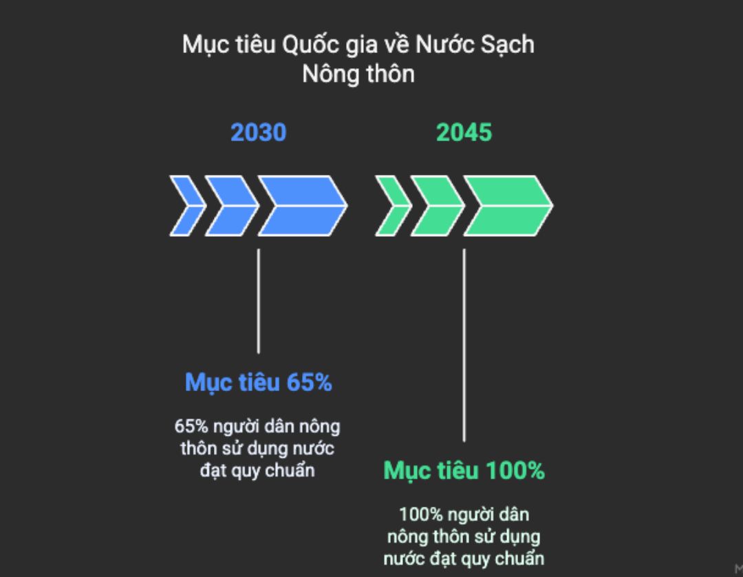 Theo mục tiêu Chiến lược quốc gia về cấp nước và vệ sinh nông thôn đến năm 2030, tầm nhìn đến năm 2045, có 65% người dân nông thôn sử dụng nước đạt quy chuẩn vào năm 2030 và 100% người dân nông thôn sử dụng nước đạt quy chuẩn vào năm 2045.