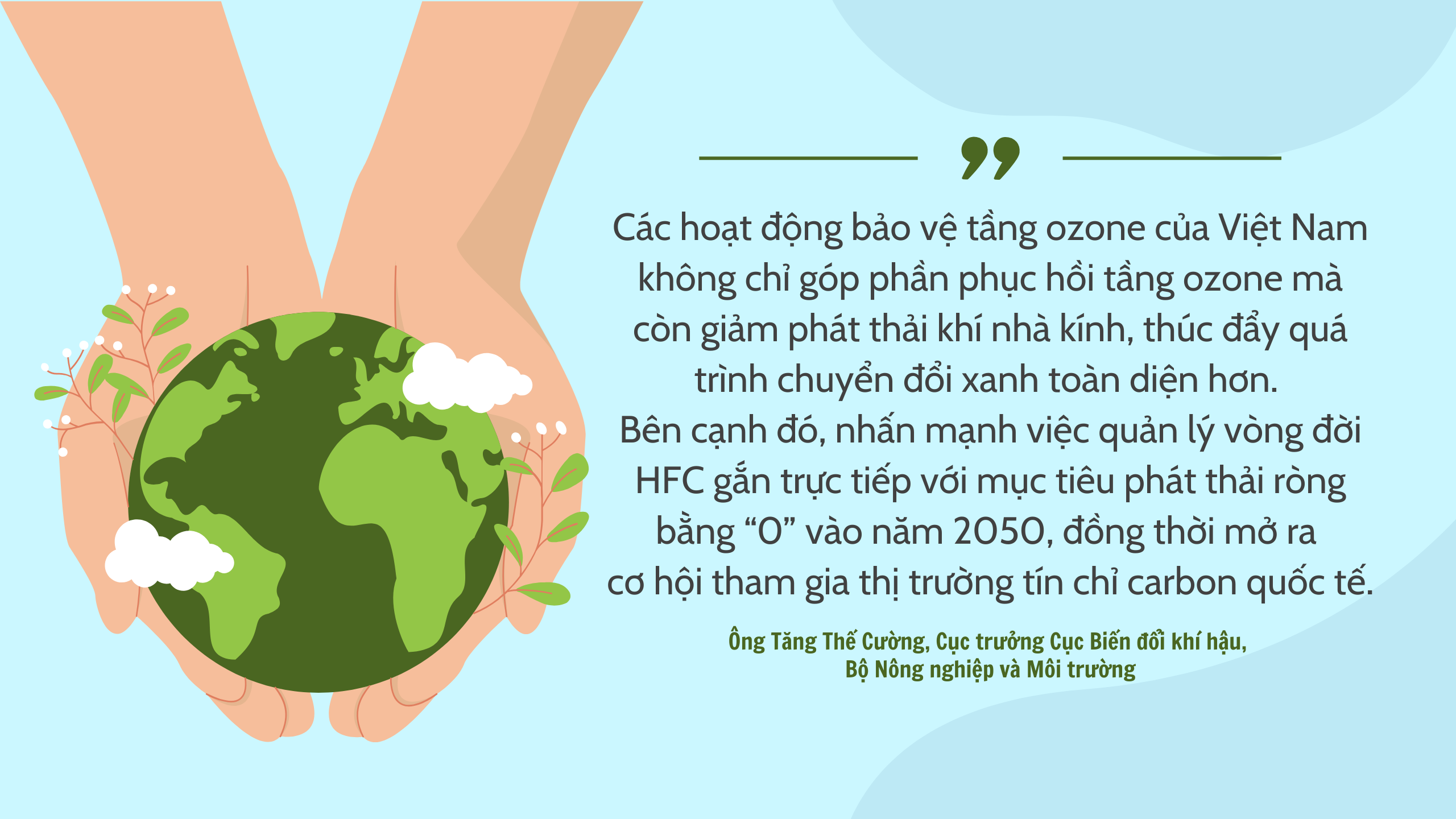 Theo ông Tăng Thế Cường, Cục trưởng Cục Biến đổi khí hậu, Bộ Nông nghiệp và Môi trường, các hoạt động bảo vệ tầng ozone của Việt Nam không chỉ góp phần phục hồi tầng ozone mà còn giảm phát thải khí nhà kính, thúc đẩy quá trình chuyển đổi xanh toàn diện hơn. Bên cạnh đó, nhấn mạnh việc quản lý vòng đời HFC gắn trực tiếp với mục tiêu phát thải ròng bằng “0” vào năm 2050, đồng thời mở ra cơ hội tham gia thị trường tín chỉ carbon quốc tế.