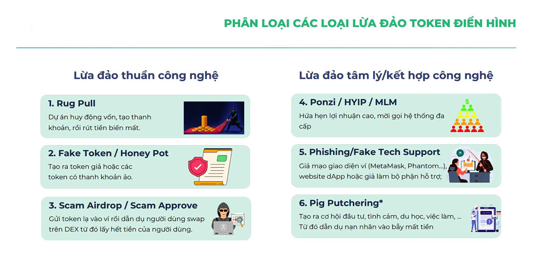 Các thủ đoạn lừa đảo hiện nay rất đa dạng, với nhiều cách phân loại khác nhau. Có báo cáo chia thành 7 hình thức, có báo cáo phân chia tới 12, 15 hình thức. Nhưng nhìn chung, phần lớn các vụ lừa đảo đều đi theo quy trình thao túng tâm lý tương đối giống nhau, có thể chia thành 3 dạng: Giao dịch siêu lợi nhuận, Lôi kéo bằng giao dịch rất nhỏ trong đám đông lớn và lợi nhuận rất cao từ chuỗi giao dịch không có sản phẩm thực tế, mọi lợi nhuận thường chỉ được hiện lên qua ứng dụng (app).Đến một thời điểm nhất định, khi nạn nhân muốn rút tiền, họ phát hiện không thể rút được, dù ứng dụng vẫn hiển thị lợi nhuận lớn. Lúc đó, đối tượng thực hiện hành vi “rút thảm” (rug pull) chiếm đoạt toàn bộ và biến mất.