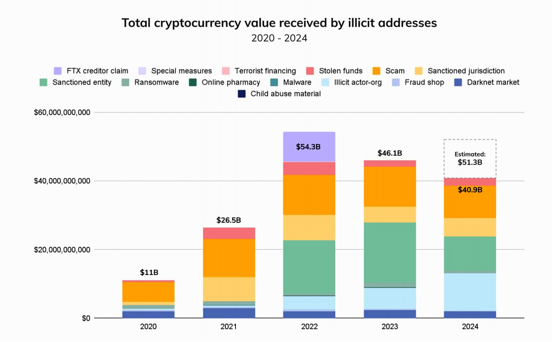 Tổng giá trị tiền mã hóa (đơn vị: tỷ đô-la Mỹ) được chuyển đến các địa chỉ phi pháp trong giai đoạn 2020–2024. (Nguồn: Chainalysis)