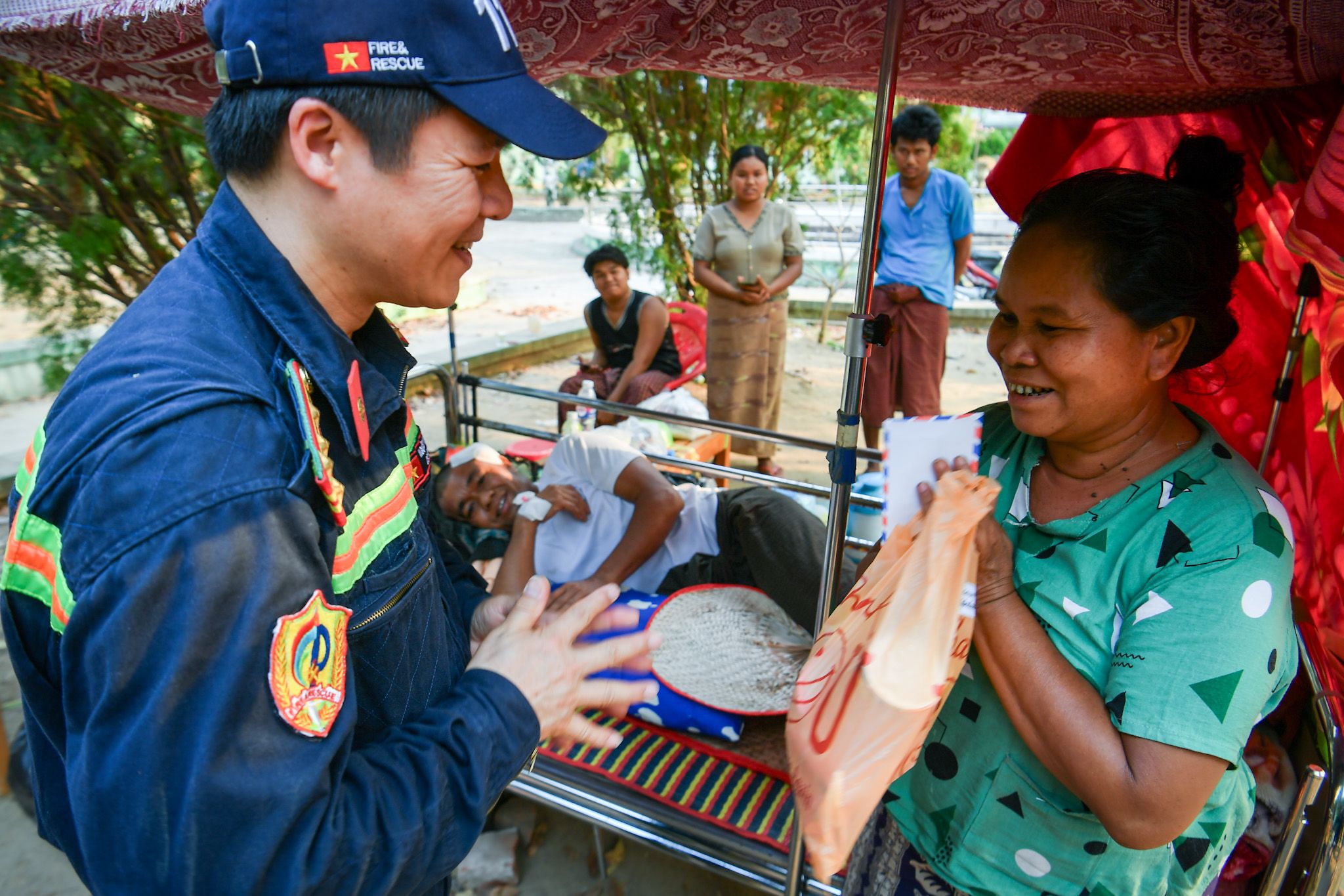 Touché par son histoire, le lieutenant-colonel Nguyên Thang Anh, chef adjoint du département d’interprétation du ministère vietnamien de la Défense, a alerté sa délégation. Immédiatement, le général de division Phạm Văn Tỵ, directeur adjoint du Département de sauvetage et de secours de l’État-major général, a décidé d’offrir à la famille de Myat une tente ainsi que des vivres: nouilles instantanées, conserves, eau potable...
