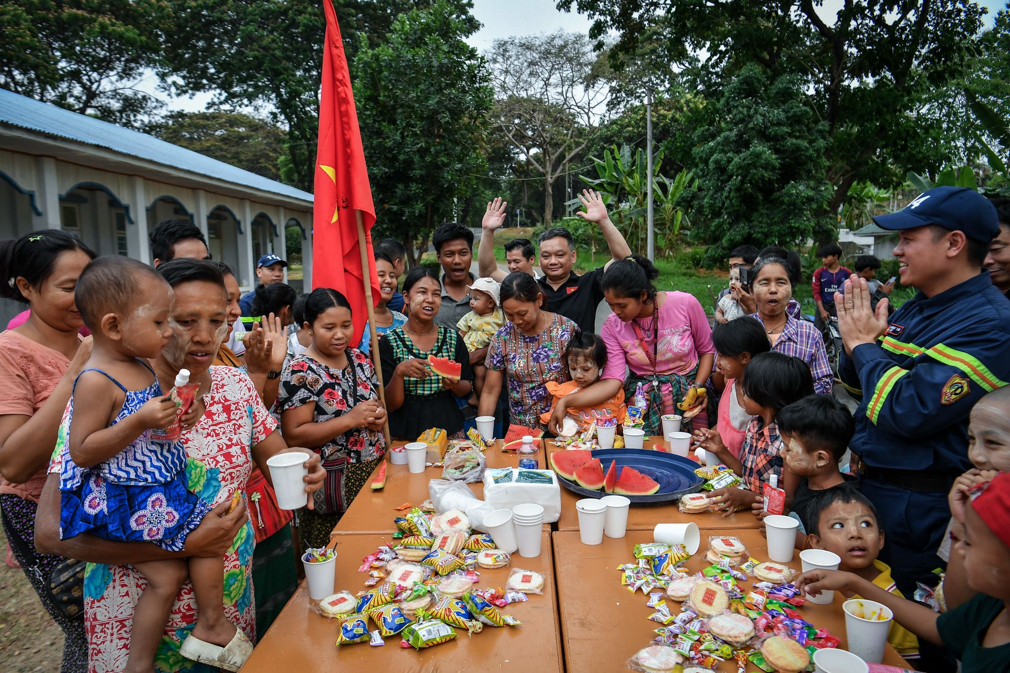 Lors de l’après-midi du dernier jour à Naypyidaw, les quartiers où logeait la délégation du ministère vietnamien de la Sécurité publique étaient plus animés que d’ordinaire. Dès les premières heures, les membres de l’équipe s’étaient réparti les tâches pour inventorier les rations sèches et les aliments instantanés restants. Le tout a été soigneusement disposé sur de grands plateaux, eux-mêmes posés sur six bureaux assemblés avec soin au milieu de la cour. Un drapeau national vietnamien trônait fièrement dans un coin, donnant à cette modeste collation une valeur toute particulière.