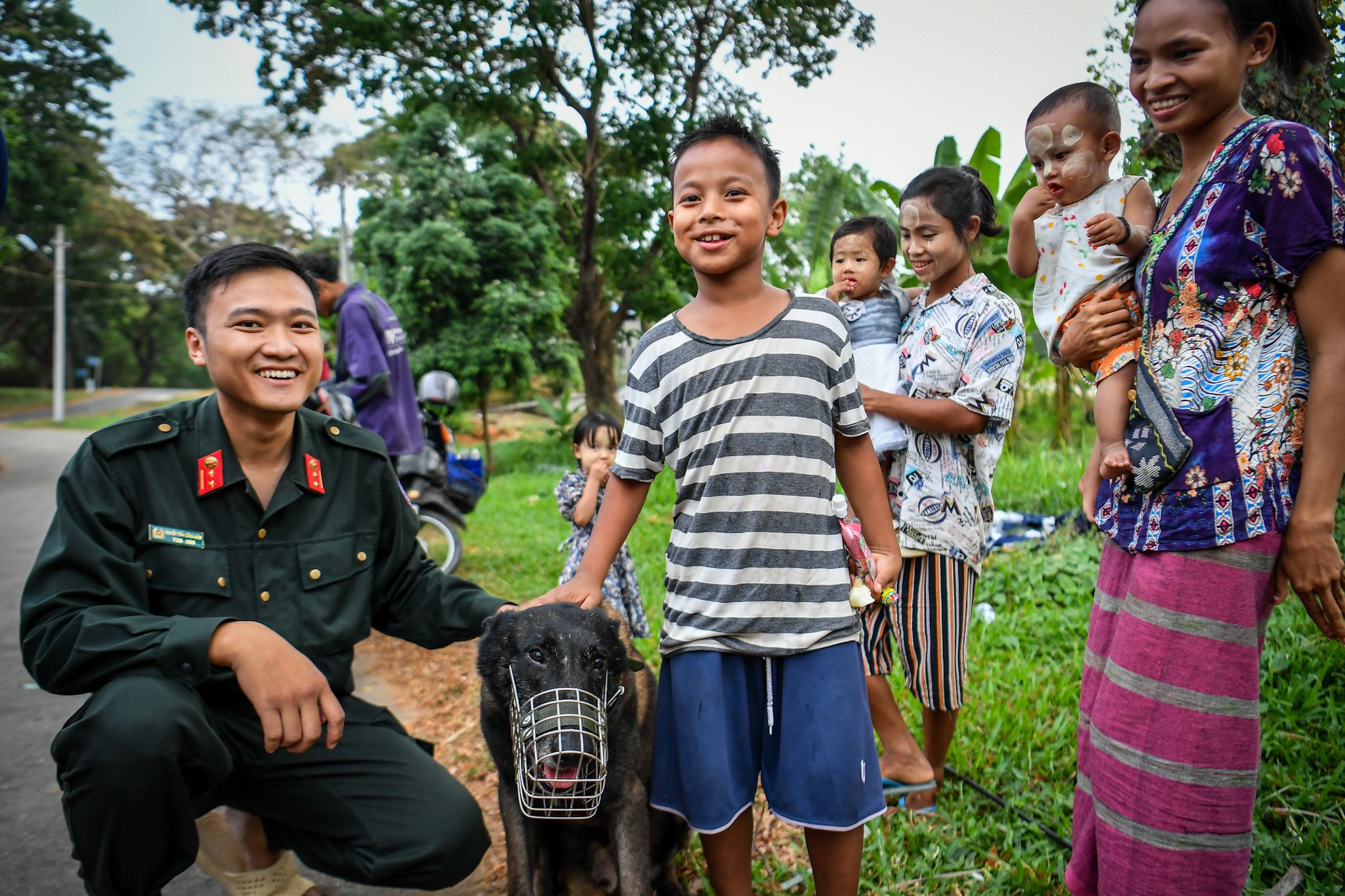 Malgré la barrière de la langue, les échanges entre les deux parties se faisaient à l’aide de gestes… et de sourires. Les adultes tenaient à prendre une photo souvenir avec l’ensemble de la délégation, tandis que les enfants étaient tout excités à Bin et King, les deux chiens de sauvetage.