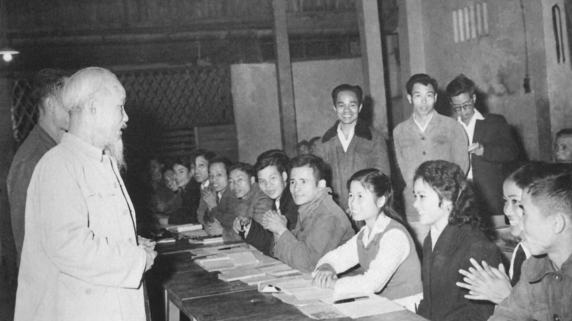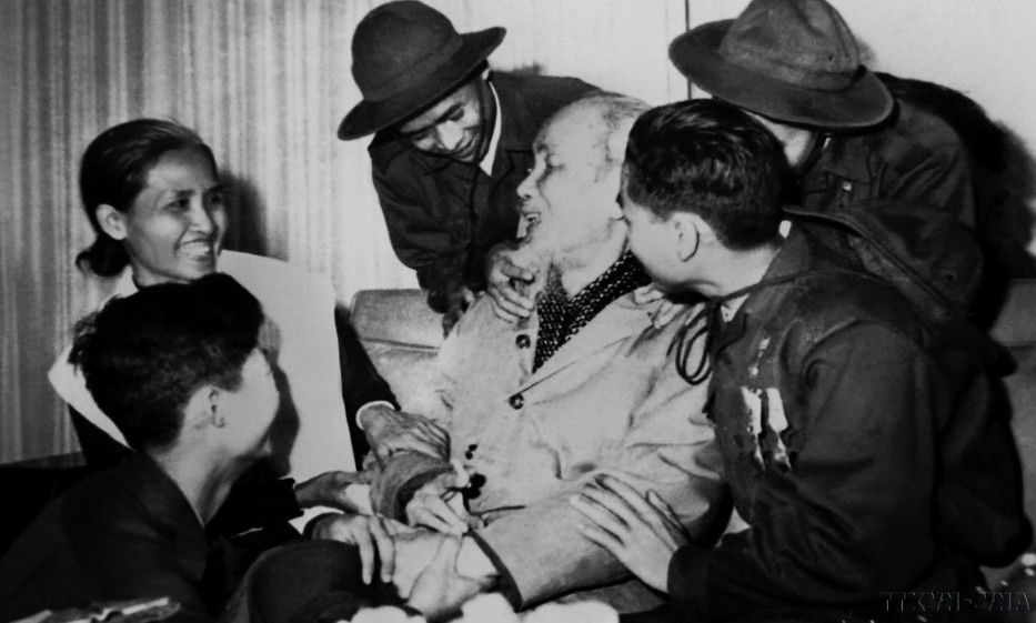 Chủ tịch Hồ Chí Minh với các anh hùng, dũng sĩ diệt Mỹ trong Đoàn đại biểu Mặt trận Dân tộc Giải phóng miền Nam Việt Nam, tại Phủ Chủ tịch, ngày 28/2/1969. (Ảnh: TTXVN)